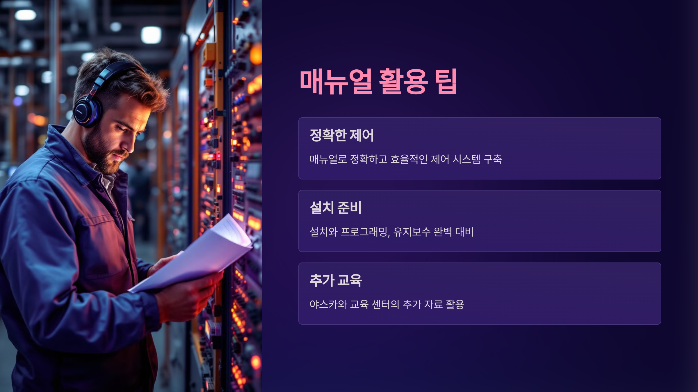 야스카와 PLC 매뉴얼을 통해 정확하고 효율적인 제어 시스템을 구축할 수 있습니다. 공식 웹사이트에서 필요한 자료를 다운로드하여 설치와 프로그래밍, 유지보수까지 완벽히 대비하세요. 필요한 경우 야스카와 교육 센터에서 제공하는 추가 교육 자료와 프로그램을 활용하는 것도 좋습니다.