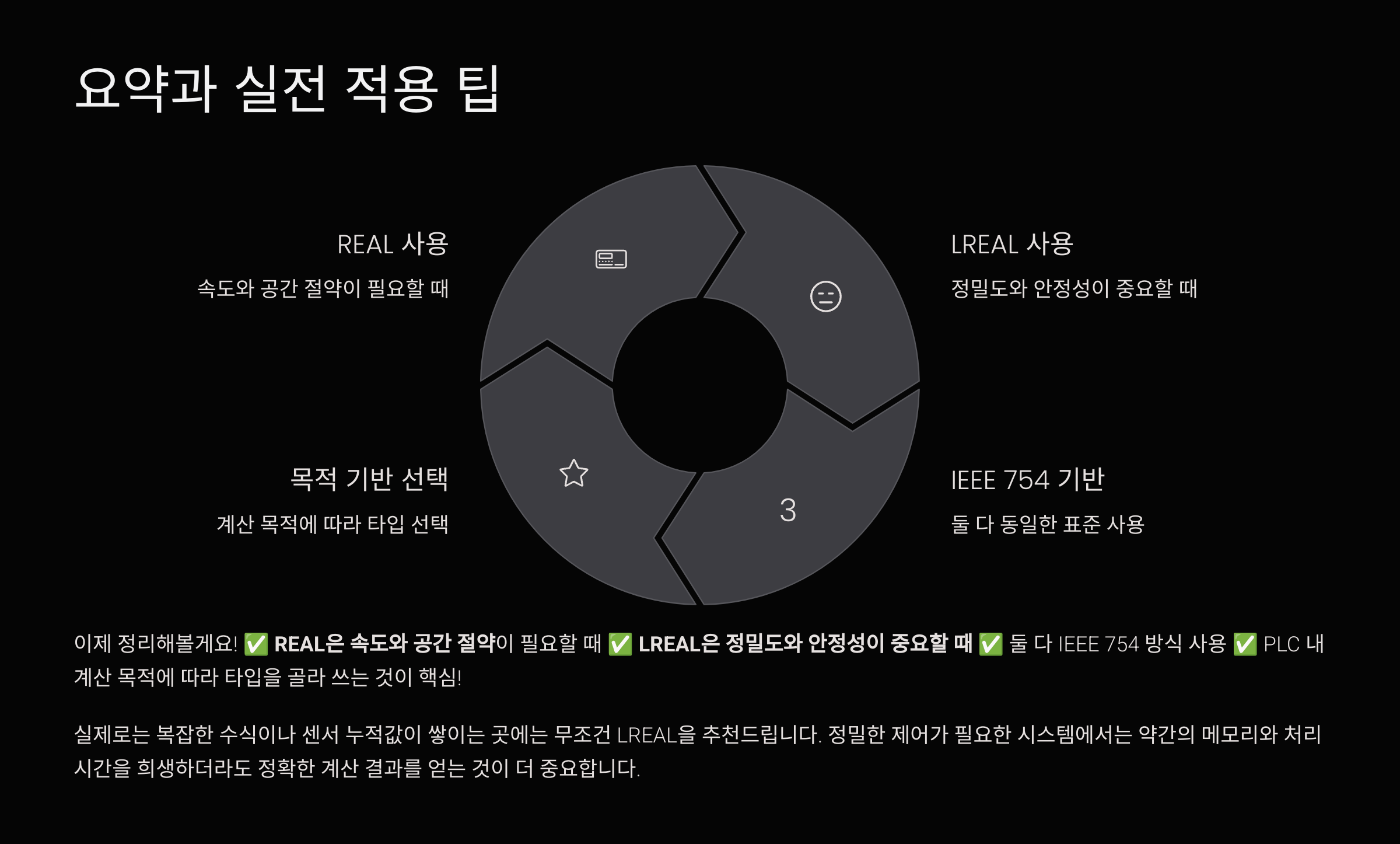 📌 메모리 사용량: LREAL은 REAL보다 2배 크기이므로 메모리 제한이 있는 컨트롤러에서는 신중히 선택해야 해요.