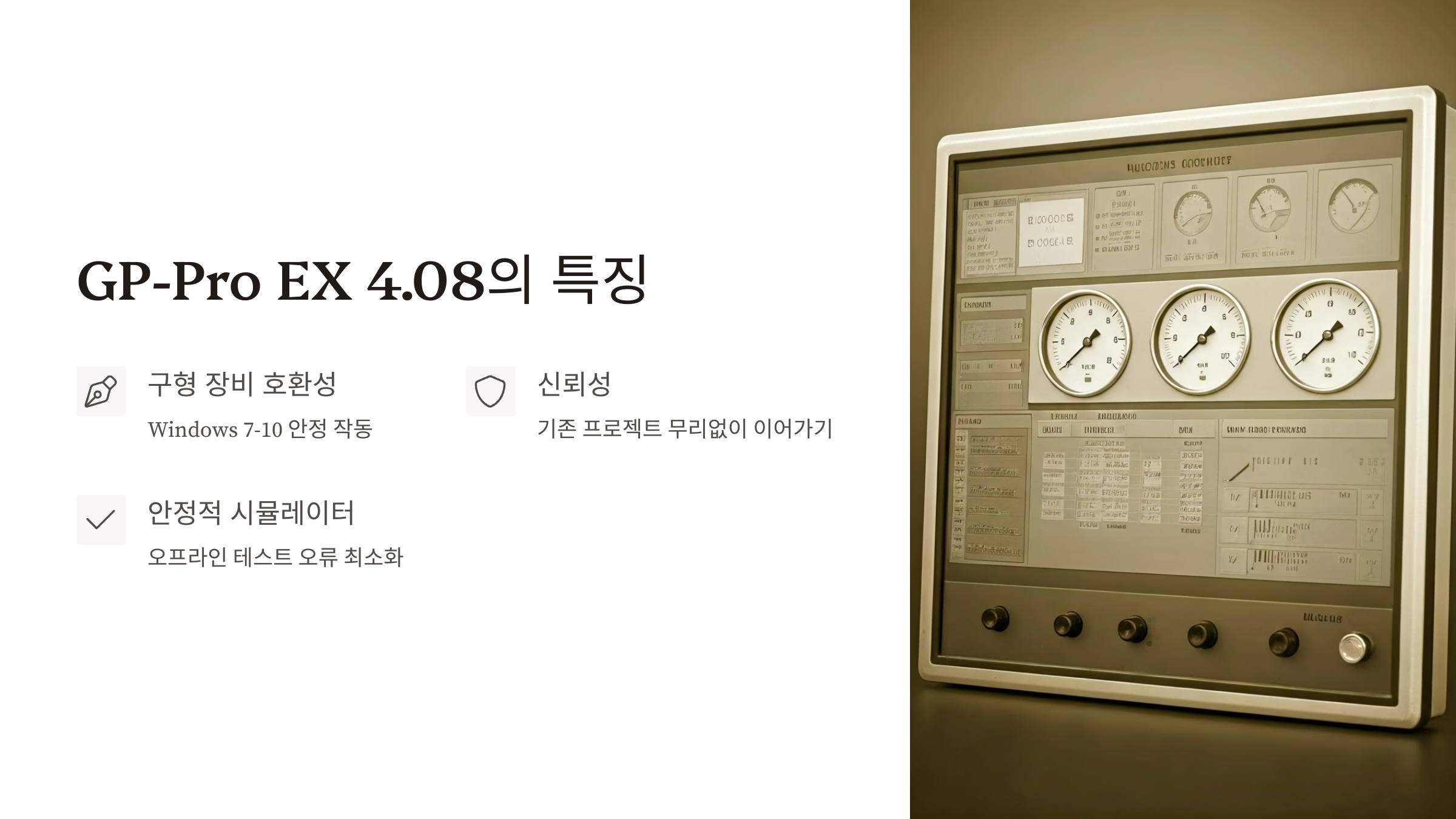 - ✅ GP-Pro EX 4.08: 안정성, 구형 장비와의 호환 중시