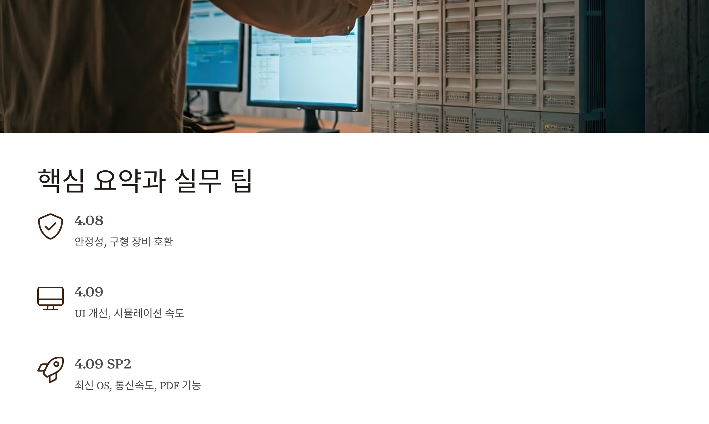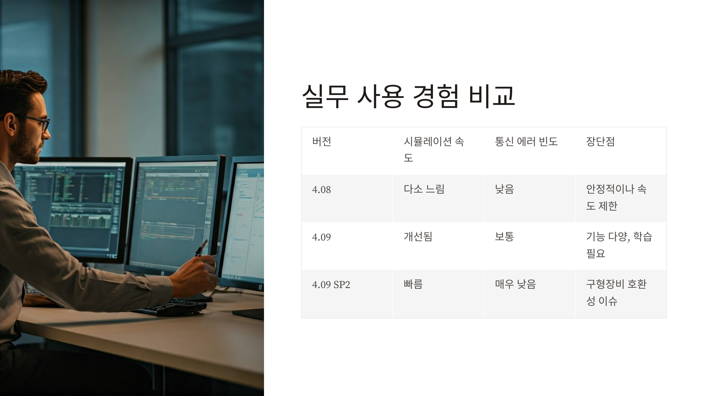 실제로 제가 여러 설비 프로젝트에 이 세 가지 버전을 적용해봤을 때 느꼈던 가장 큰 차이는 “시뮬레이션 반응 속도”와 “통신 에러 빈도”였습니다. 4.08은 안정적이지만 반응 속도가 다소 느렸고, 4.09는 기능이 다양해져서 초기에 약간의 학습이 필요했어요. 반면 4.09 SP2는 빠르고 직관적이지만, 구형 장비와의 연결에서는 약간의 호환성 이슈가 발생할 수 있었습니다. 따라서 사용하는 장비와 프로젝트 규모에 따라 선택을 달리해야 한다는 게 제 결론이에요.