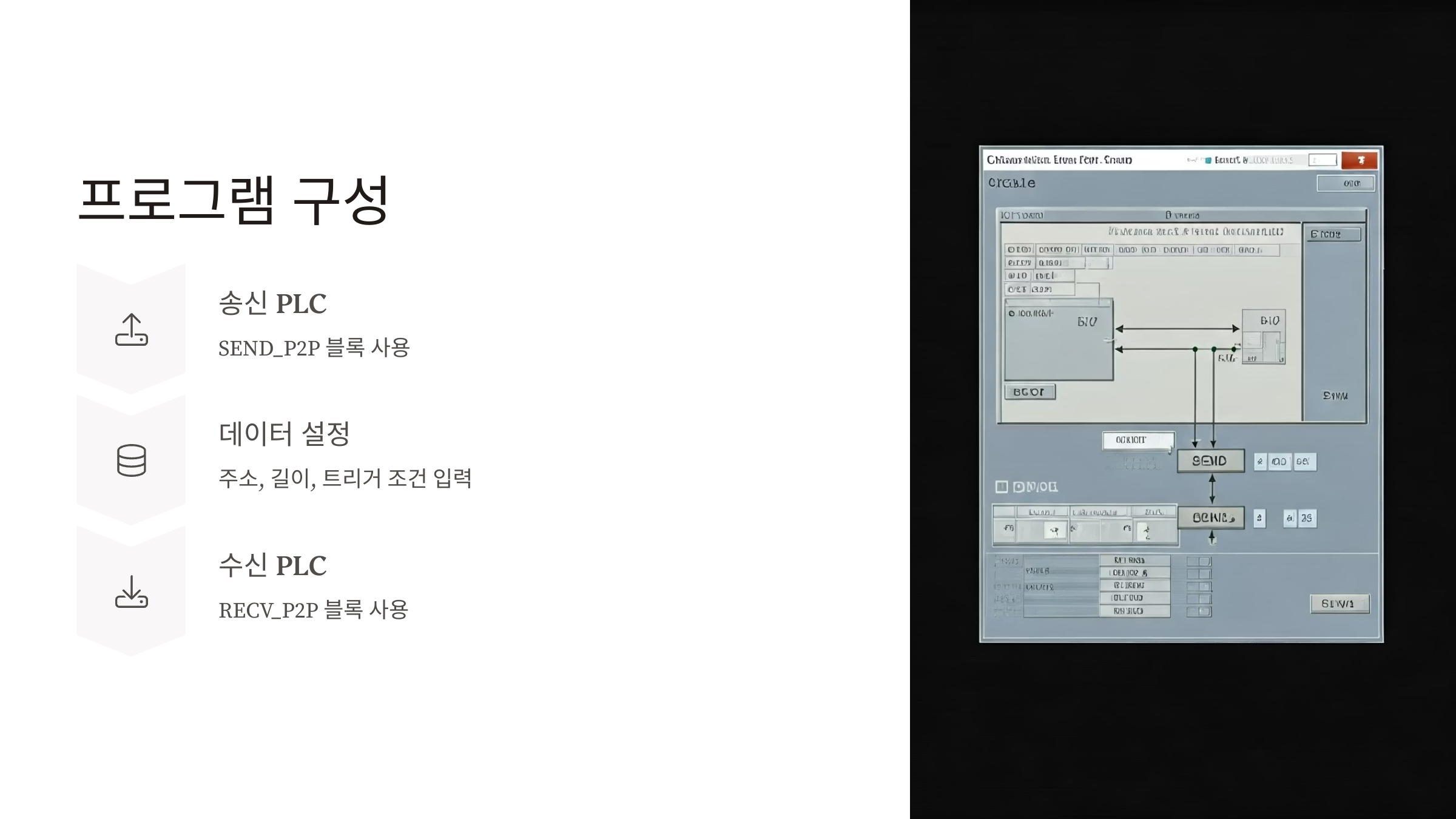 이제 프로그램 구성을 해야겠죠. 데이터를 보내는 쪽(송신 PLC)에는 SEND_P2P 블록을 사용하고, 받는 쪽(수신 PLC)에는 RECV_P2P 블록을 사용해요. 블록 안에는 다음 정보를 입력해야 해요: