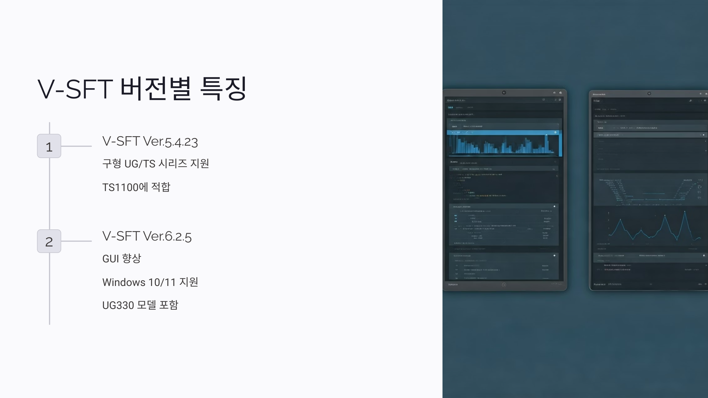 - V-SFT Ver.5.4.23: 구형 UG 시리즈나 TS 시리즈를 지원하는 안정적인 버전. TS1100에 적합