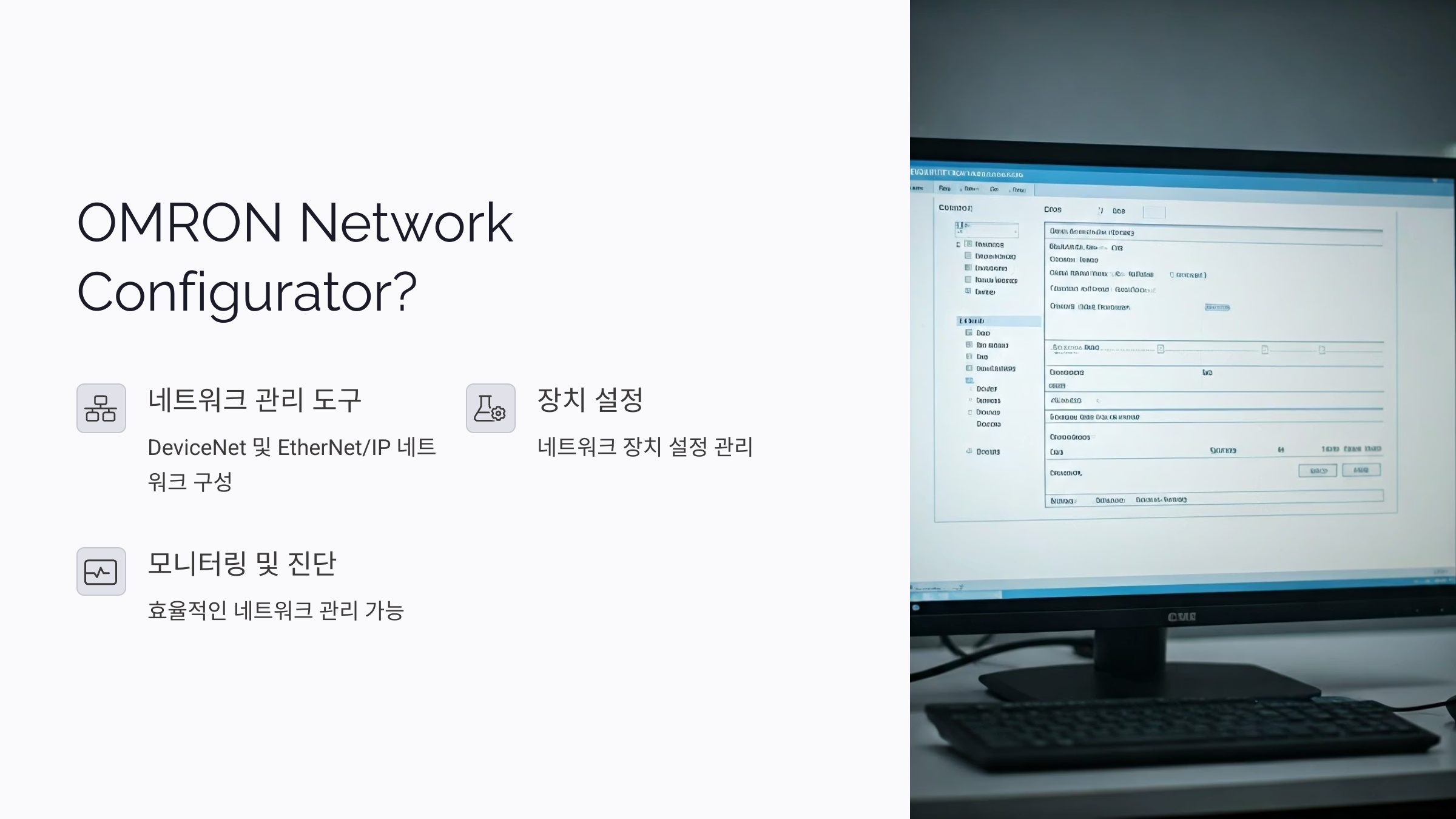 OMRON의 Network Configurator는 DeviceNet 및 EtherNet/IP 네트워크를 구성하고 관리하기 위한 소프트웨어입니다. 이 도구를 사용하면 네트워크 장치의 설정, 모니터링, 진단 등을 효율적으로 수행할 수 있습니다.