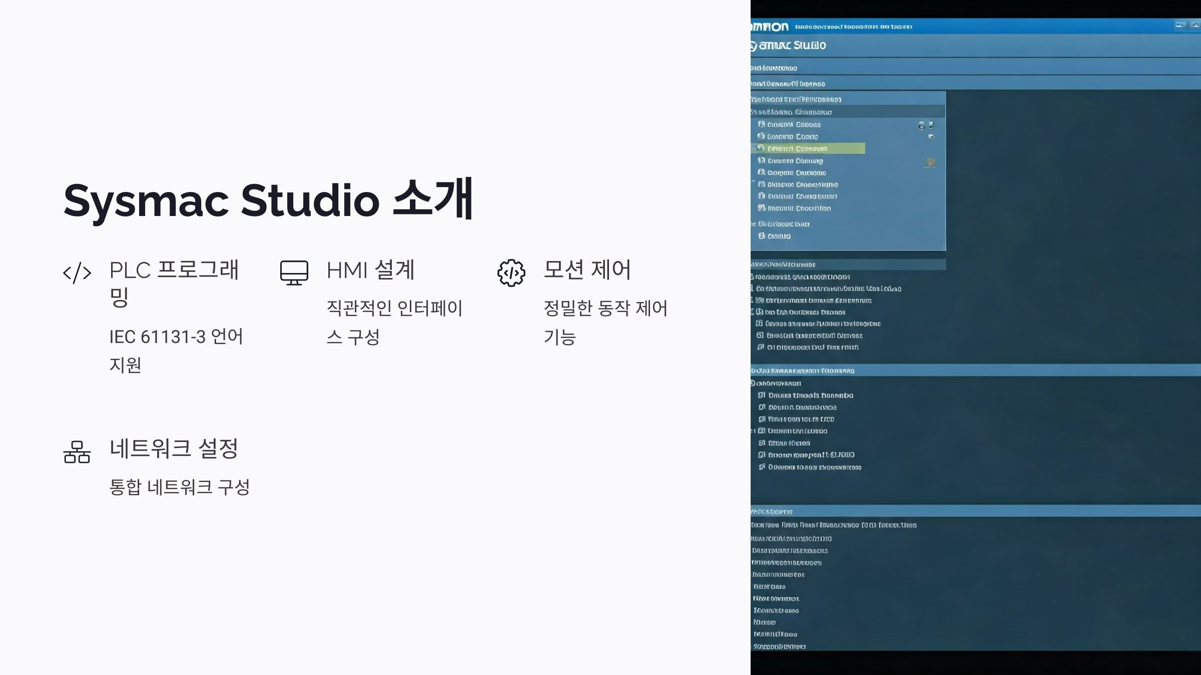 Sysmac Studio는 OMRON의 통합 개발 환경으로, PLC, HMI, 모션 제어, 네트워크 설정 등을 하나의 소프트웨어에서 구성할 수 있습니다. 이를 통해 개발자는 효율적으로 자동화 시스템을 설계하고 유지보수할 수 있습니다.
