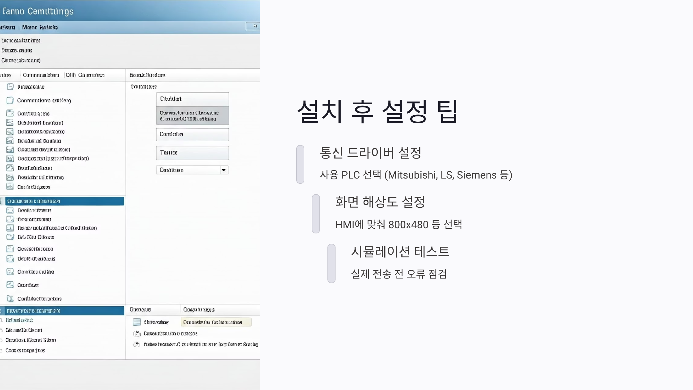 - 🌐 [통신 드라이버 설정]에서 사용 PLC 선택 (Mitsubishi, LS, Siemens 등 다수 지원)