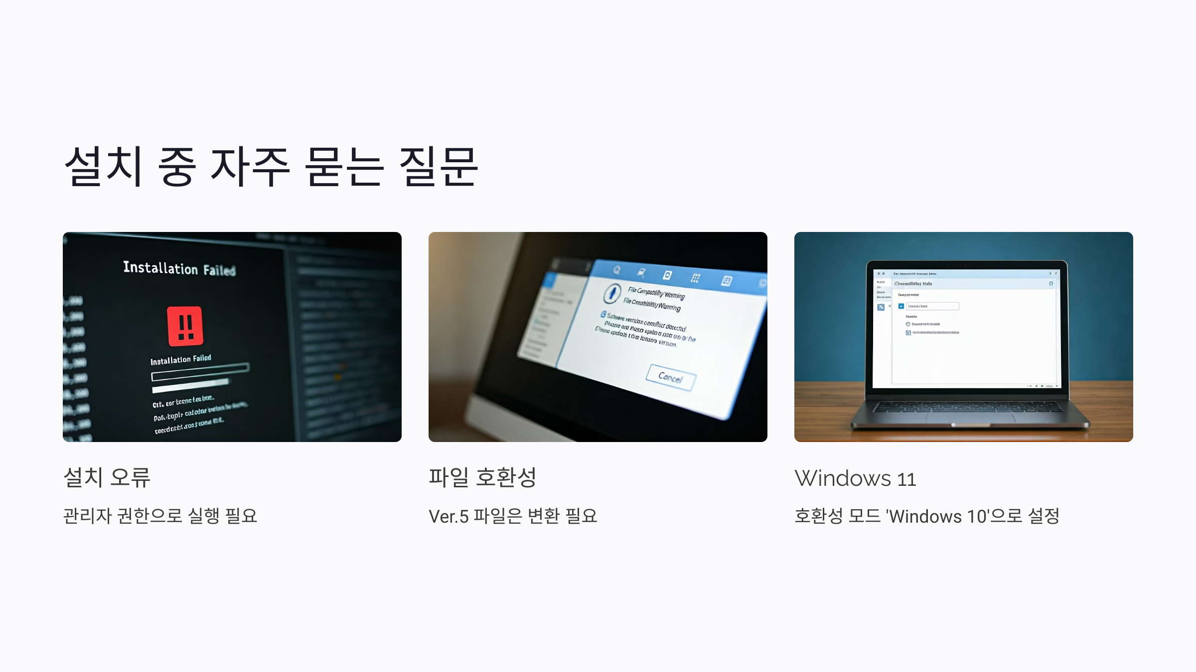 👉 Ver.6 최신 버전에서는 Windows 11도 일부 호환되며, 설치 시 호환성 모드를 ‘Windows 10’으로 설정하면 오류 없이 사용 가능해요.