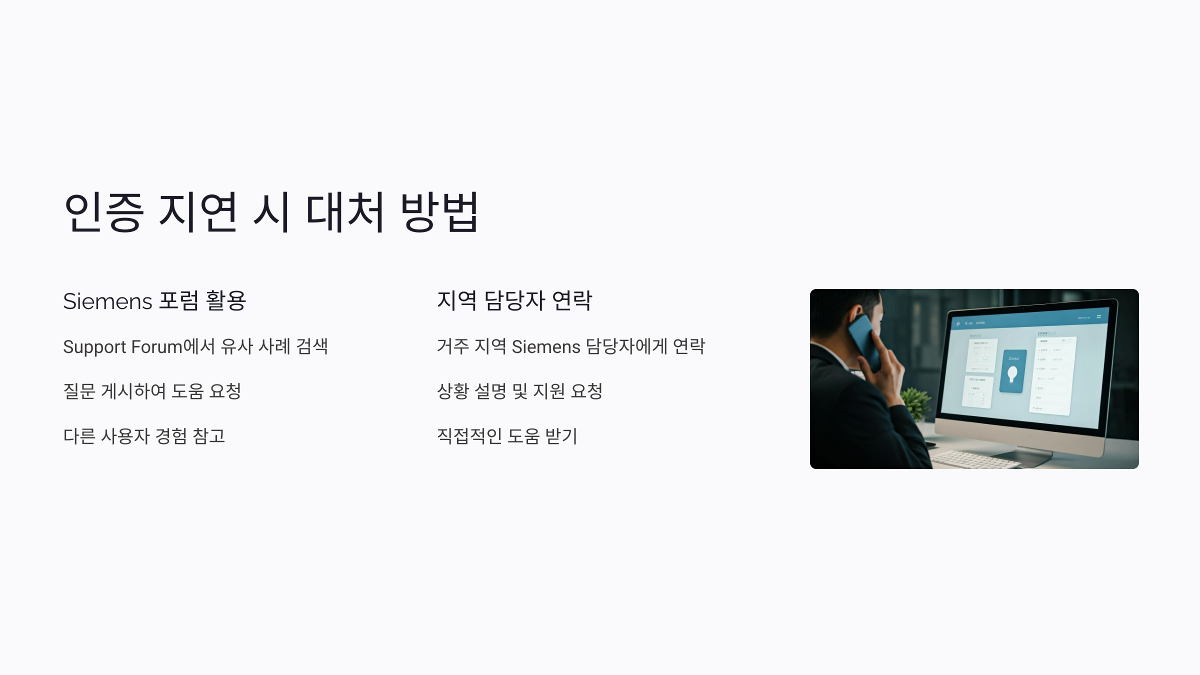 - 재요청 시 주의: 인증이 거부된 경우, 동일한 정보를 반복해서 제출하면 승인되지 않을 수 있습니다. 필요한 경우, Siemens 지원팀에 문의하여 상황을 설명하고 도움을 요청하세요.