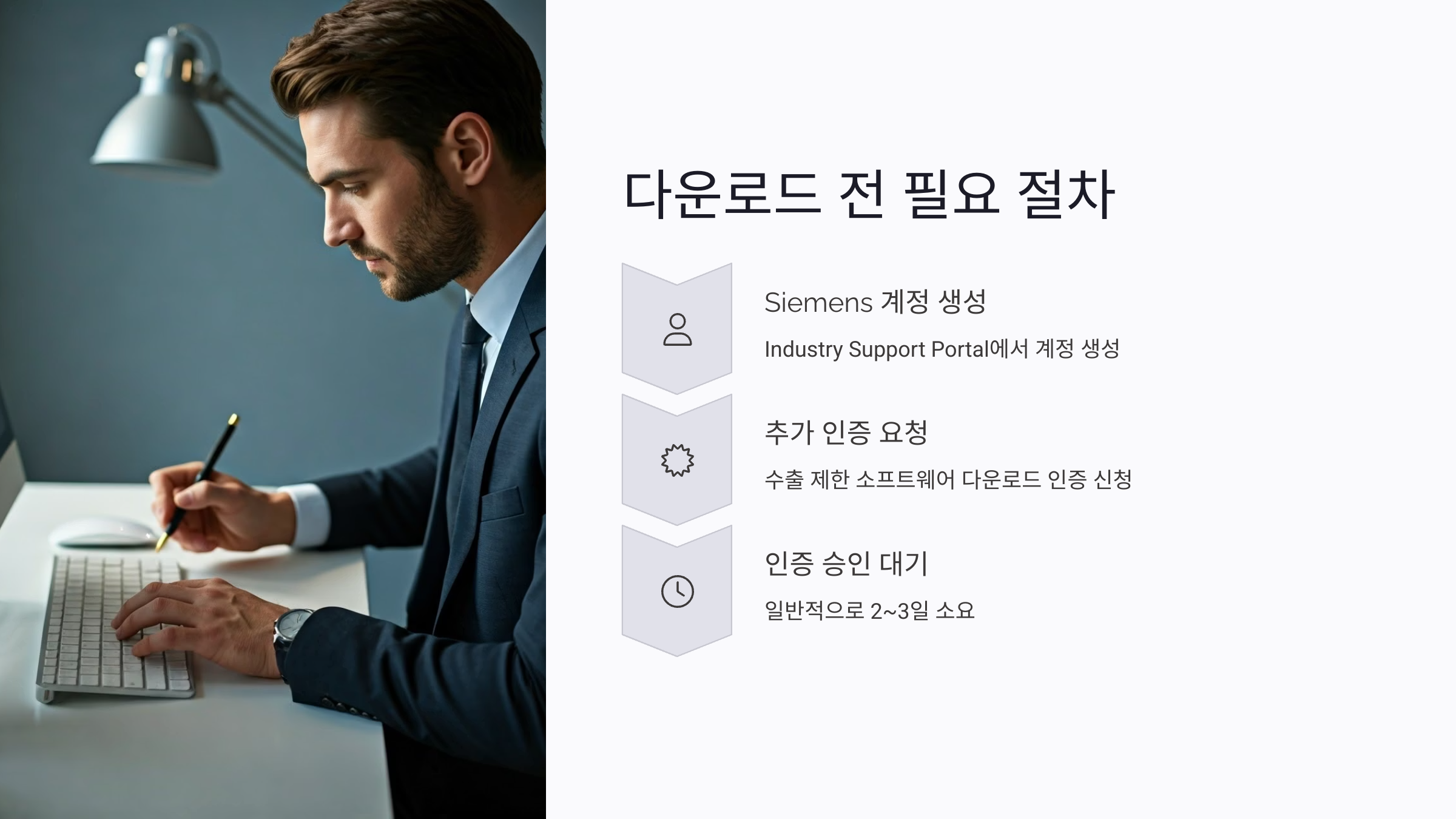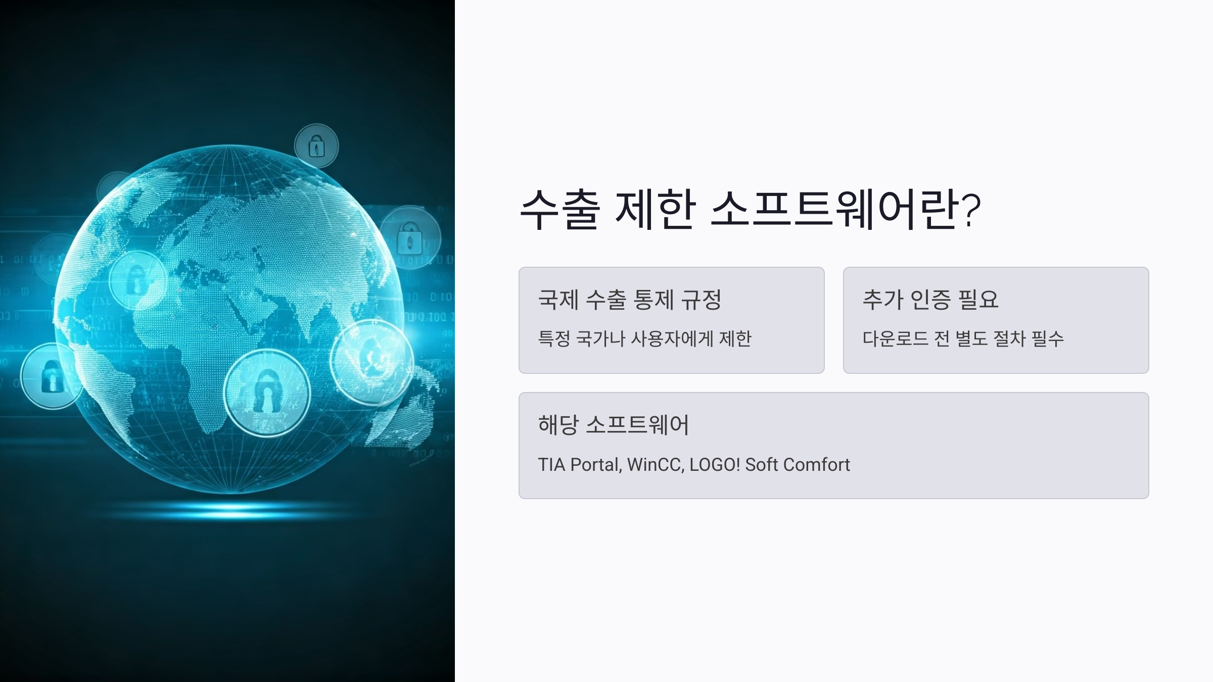지멘스의 TIA Portal, WinCC, LOGO! Soft Comfort 등 일부 소프트웨어는 국제 수출 규제에 따라 다운로드 전에 별도의 인증 절차를 거쳐야 합니다. 이 글에서는 수출 제한 소프트웨어를 안전하게 다운로드하는 방법을 단계별로 안내해드릴게요.