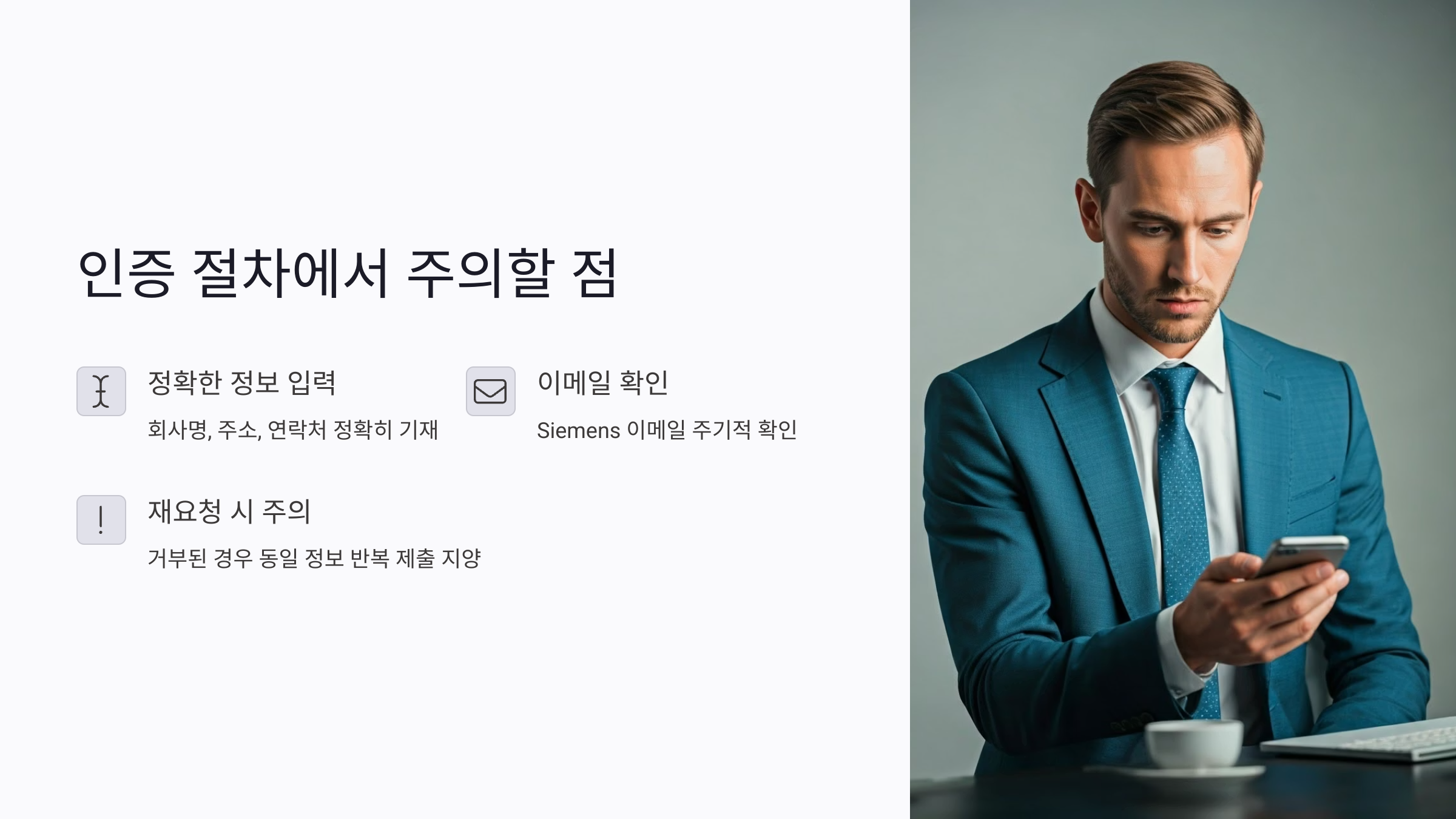 - 이메일 확인: 인증 요청 후, Siemens로부터의 이메일을 주기적으로 확인하여 추가 요청 사항에 대응합니다.