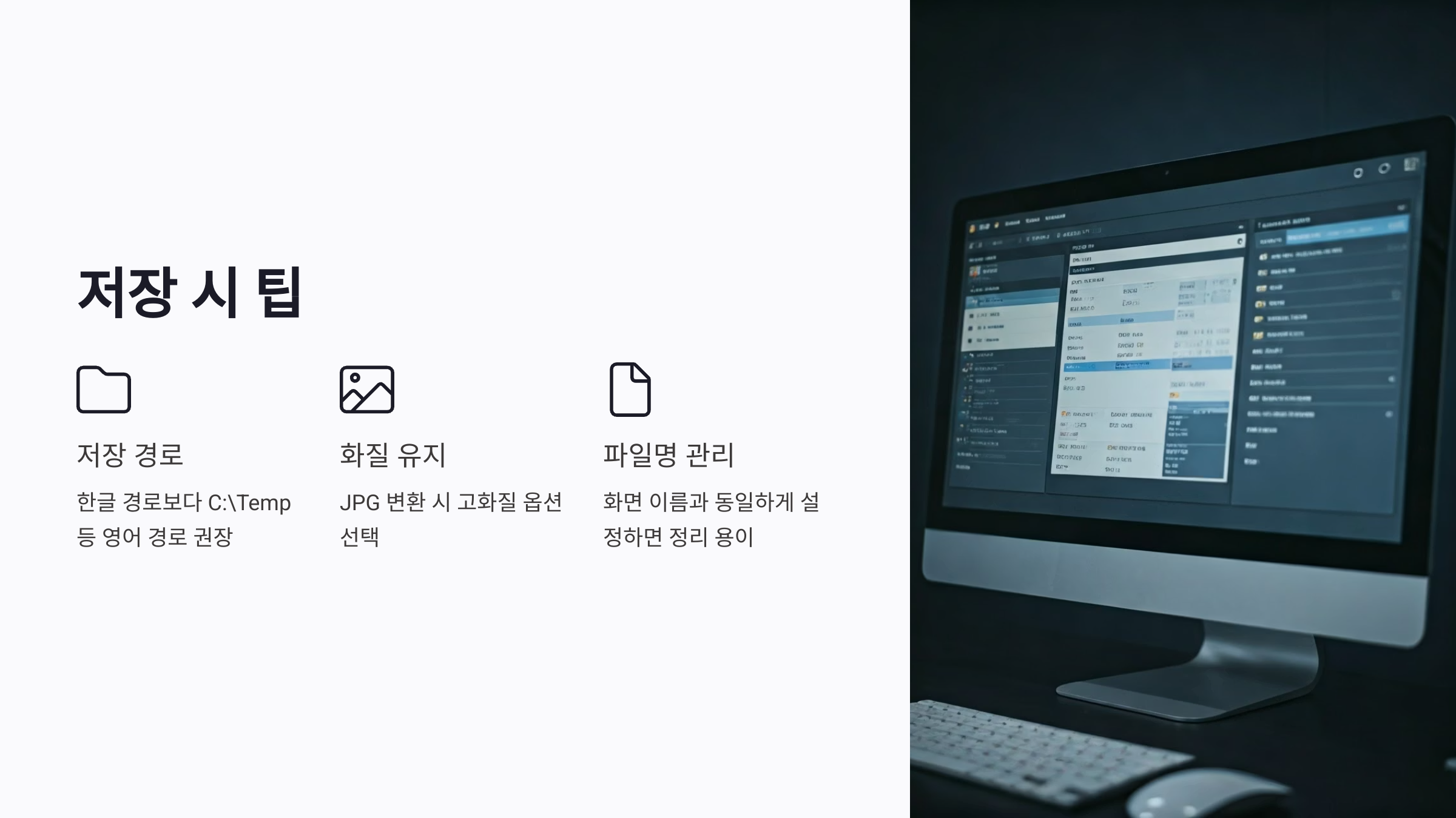 고화질 옵션을 선택하면 선명도를 유지할 수 있어요. - 📁 파일 이름은 화면 이름과 동일하게 설정하면, 나중에 프로젝트별로 정리할 때 정말 편합니다.