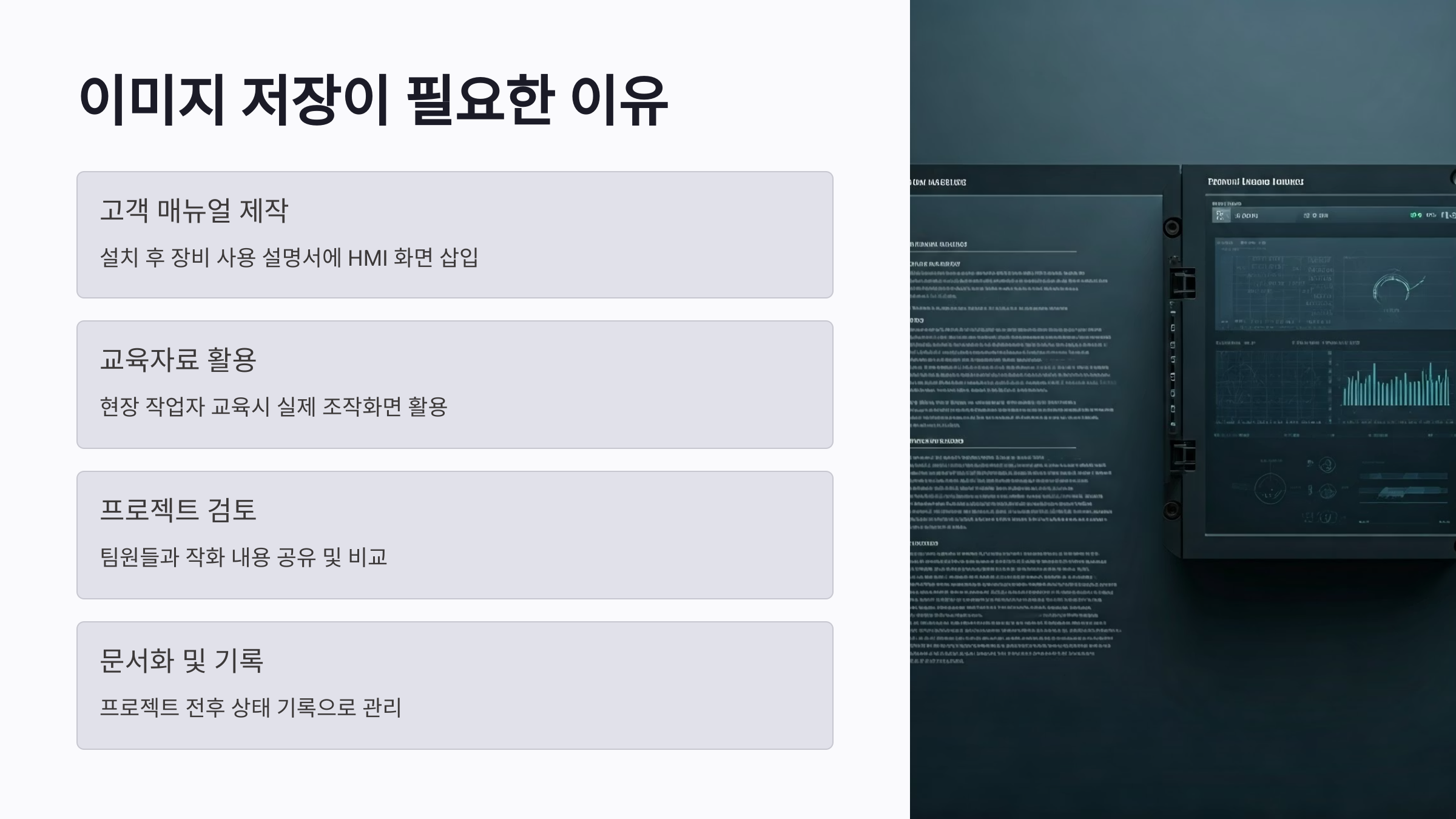 - 📄 고객 매뉴얼 제작: 설치 후 장비 사용 설명서에 HMI 화면을 그대로 삽입