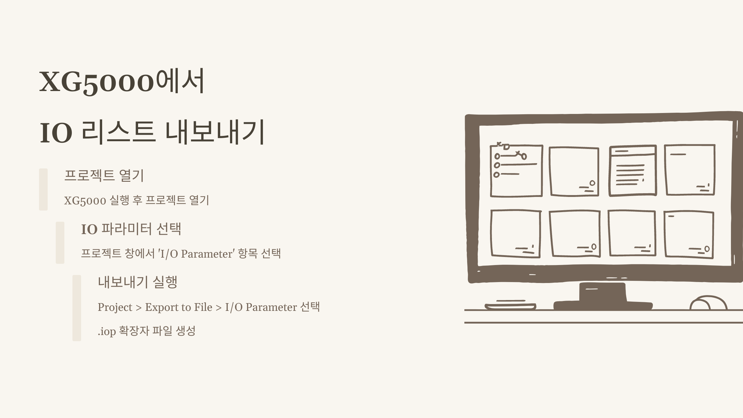 - 프로젝트 열기: XG5000 프로그램을 실행하고, IO 리스트를 추출할 프로젝트를 엽니다.