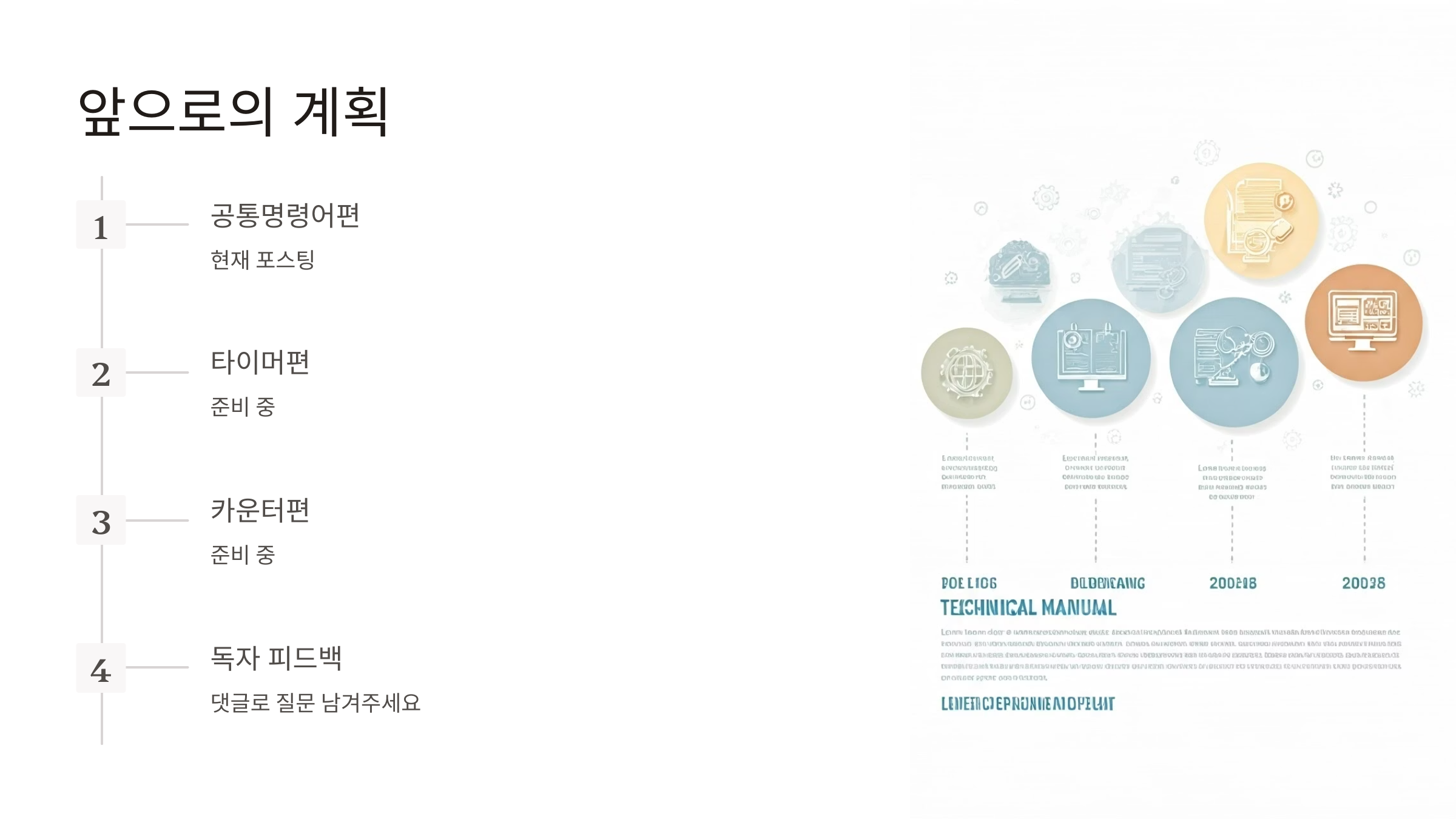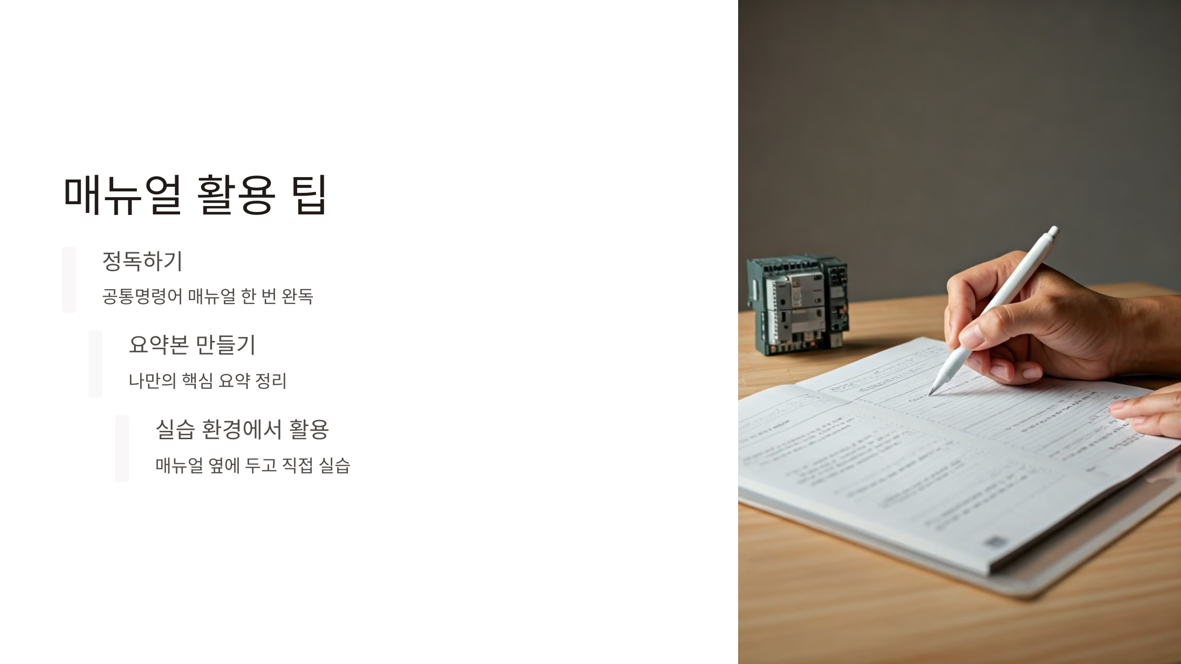 공통명령어 매뉴얼을 한 번 정독하고, 나만의 요약본을 만들어보세요. 그리고 실습 환경에서 매뉴얼을 옆에 두고 직접 써보는 게 제일 빠른 학습법이랍니다. 실제 제어 패널을 구성하면서 "어? 이거 어디서 봤는데?" 하는 순간이 오면 매뉴얼이 빛을 발하게 돼요!