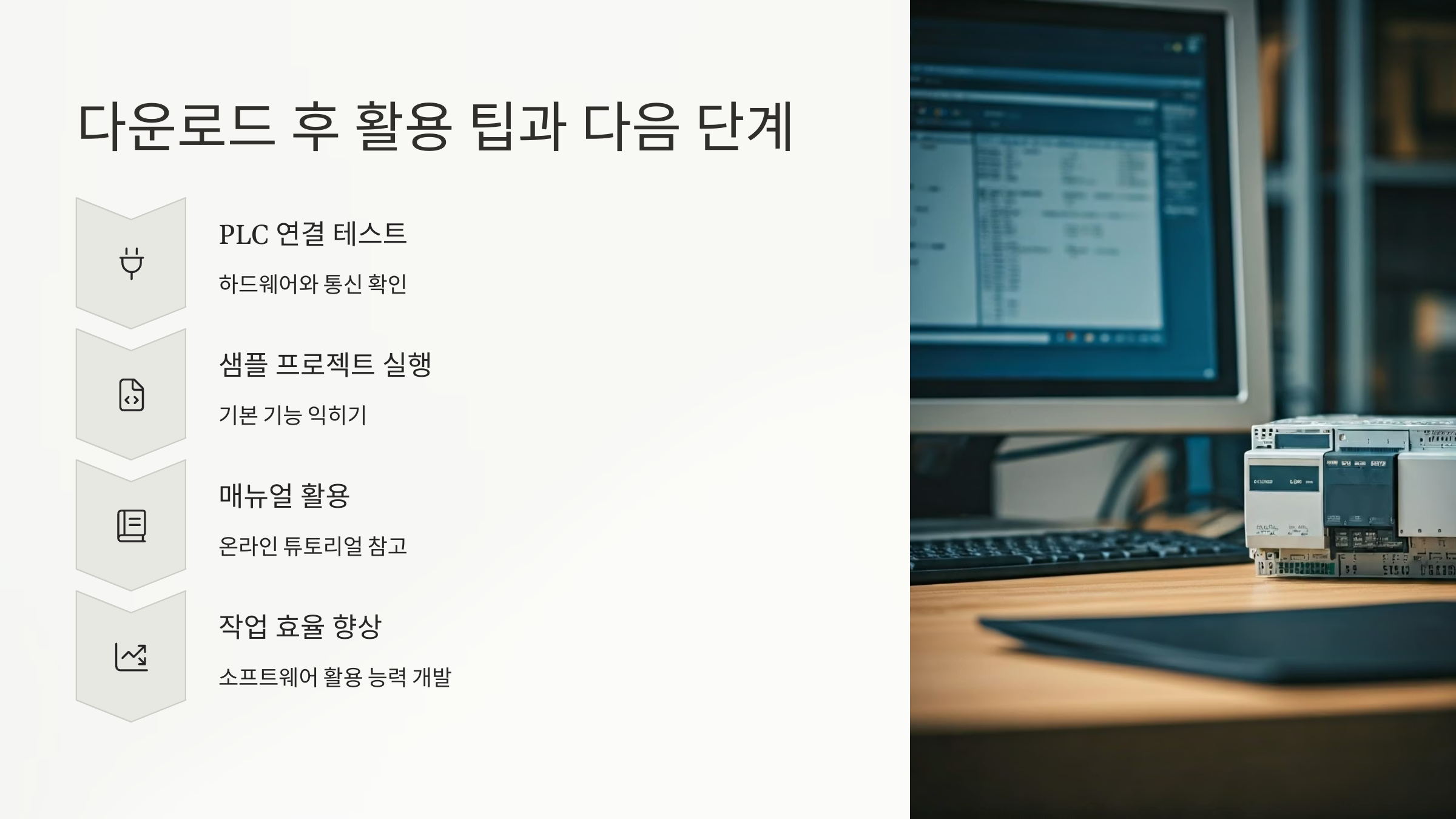설치 후에는 PLC와의 연결을 테스트하고, 샘플 프로젝트를 실행해보는 것이 좋습니다. 또한, Mitsubishi에서 제공하는 온라인 매뉴얼과 튜토리얼을 활용하여 소프트웨어 사용법을 익히는 것이 도움이 됩니다. GX Works를 잘 활용하면 작업 효율이 크게 향상됩니다.
