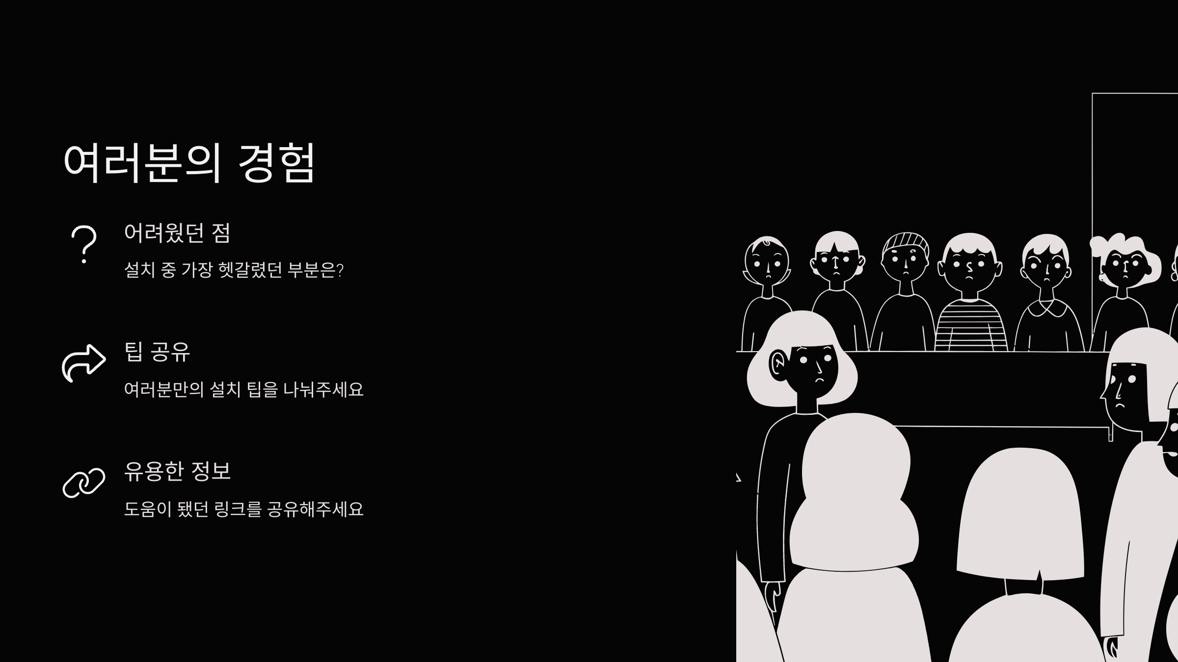 여러분만의 설치 팁이나 유용했던 링크도 함께 나눠주시면 정말 감사하겠습니다!