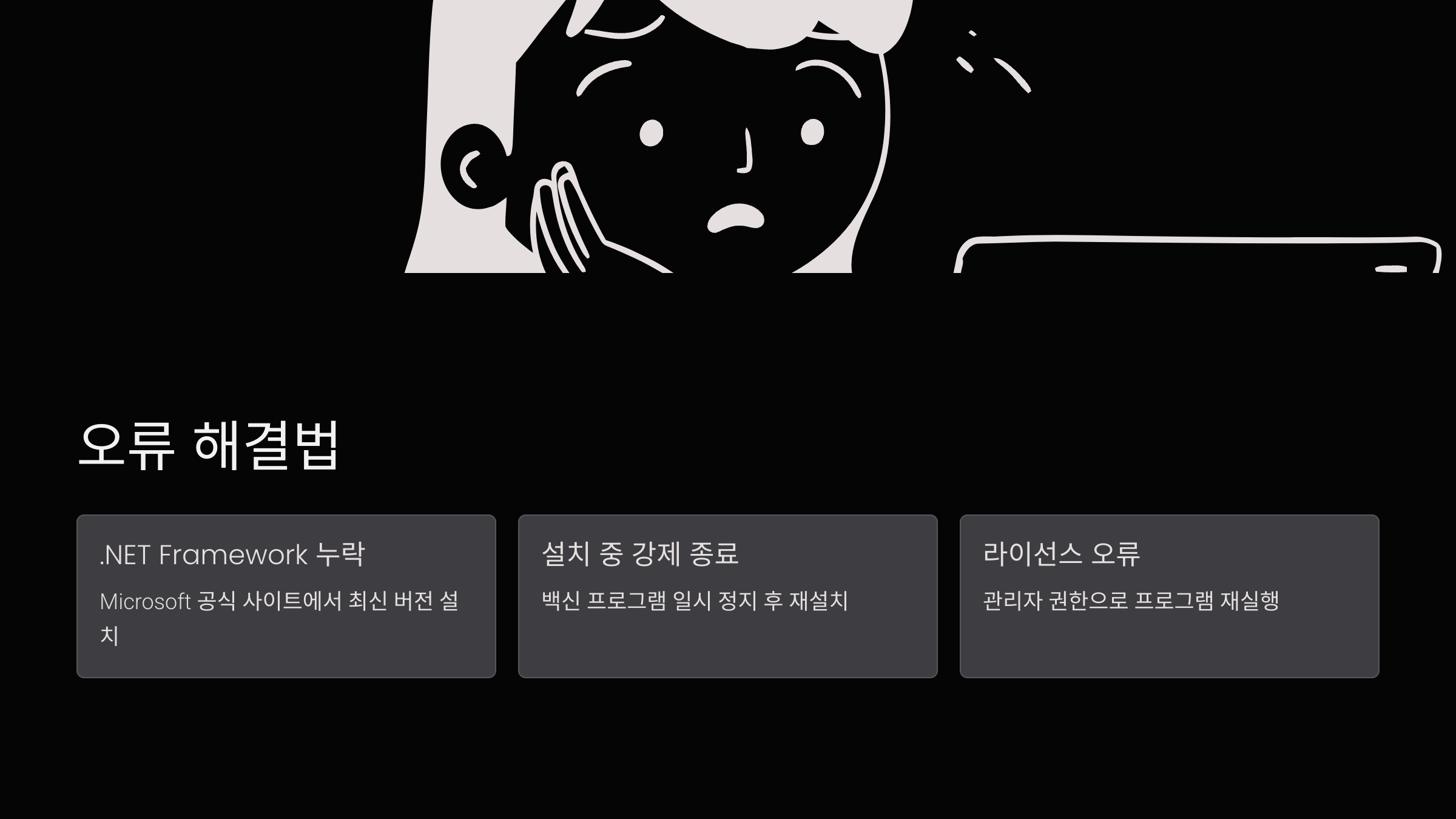 실제로 전 백신 프로그램이 설치를 방해해서 몇 번이나 실패했어요. 잠시 꺼두고 설치하니 문제없이 잘 되더라구요!