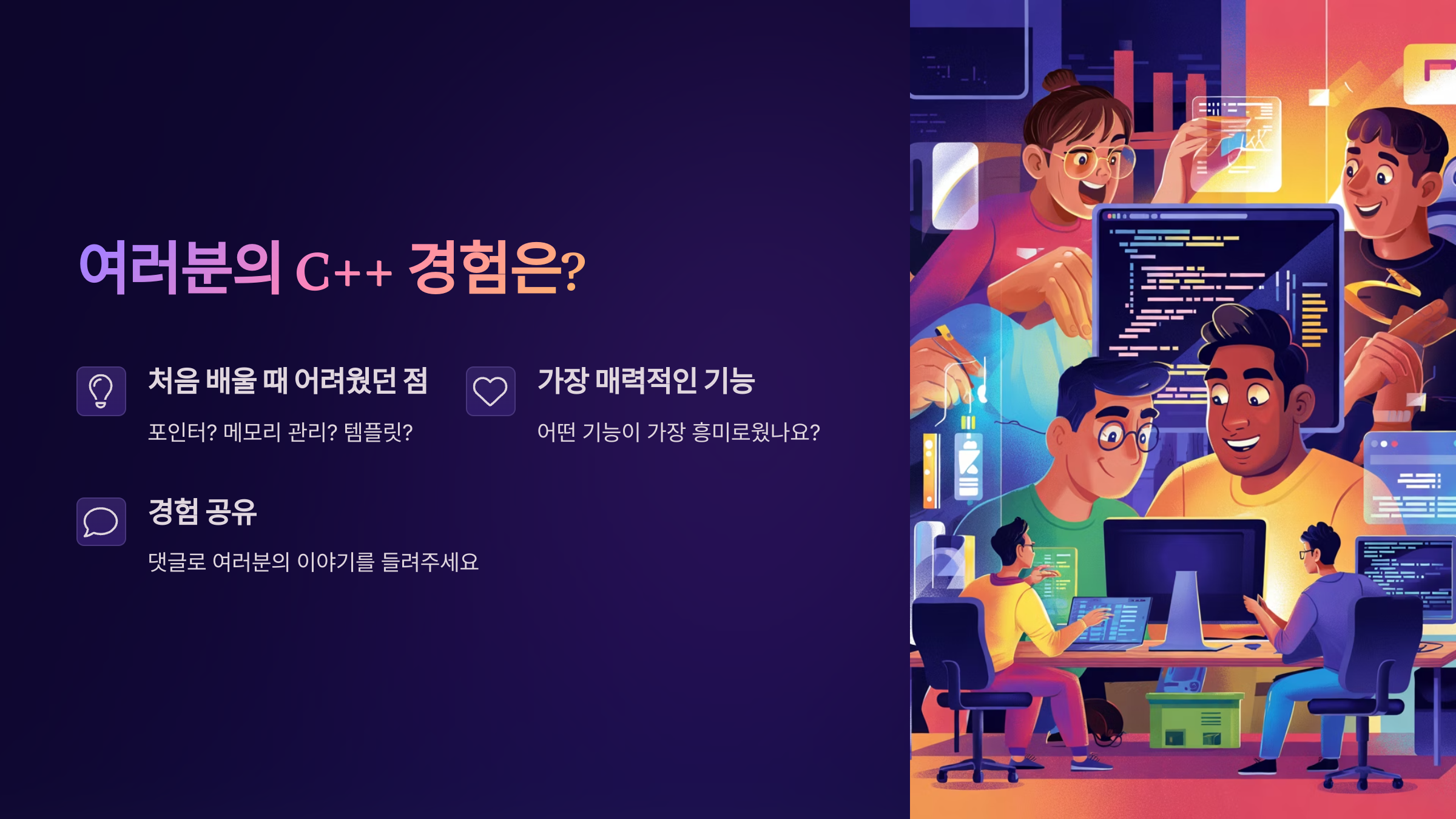 C++ 처음 배웠을 때 가장 어려웠던 부분은 무엇이었나요? 또는 지금 배우고 계시다면, 어떤 점이 가장 흥미롭게 느껴지시나요? 댓글로 경험을 공유해주세요! 함께 고민하고 도전해봐요 😊