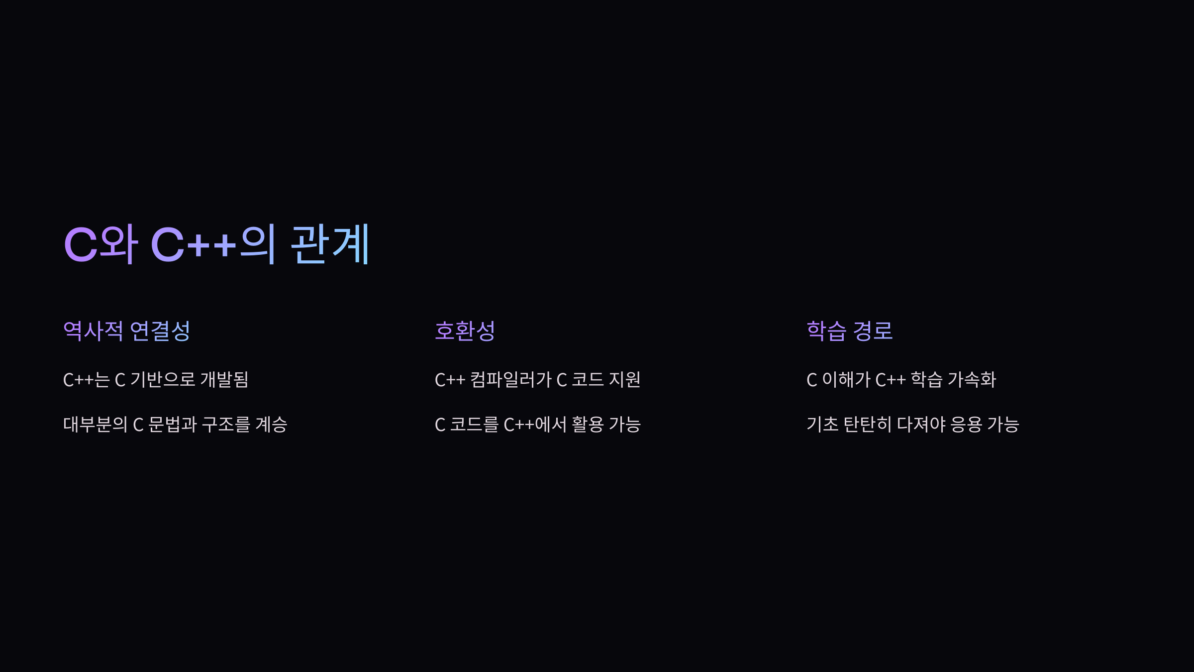 - C의 문법과 구조를 이해하면 C++의 복잡한 개념도 쉽게 받아들일 수 있습니다.