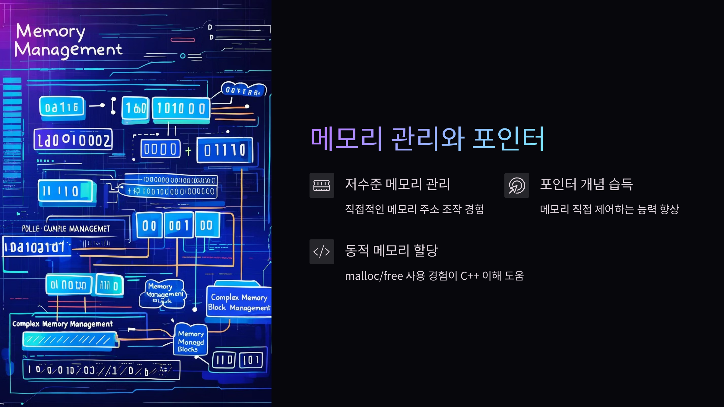 C 언어는 저수준 언어로, 메모리 관리와 포인터 개념을 직접 다루게 됩니다. 이러한 개념은 C++에서도 여전히 중요하며, 특히 성능 최적화나 시스템 프로그래밍에서 필수적입니다.