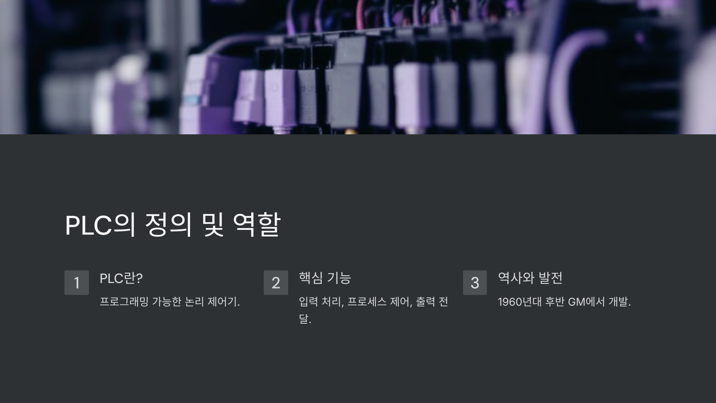 PLC는 프로그래밍 가능한 논리 제어기(Programmable Logic Controller)의 약자로, 디지털 컴퓨터 기반의 제어 시스템입니다. 센서, 스위치, 모터 등의 장비로부터 데이터를 받아들이고, 프로그래밍된 로직에 따라 특정 동작을 수행합니다.