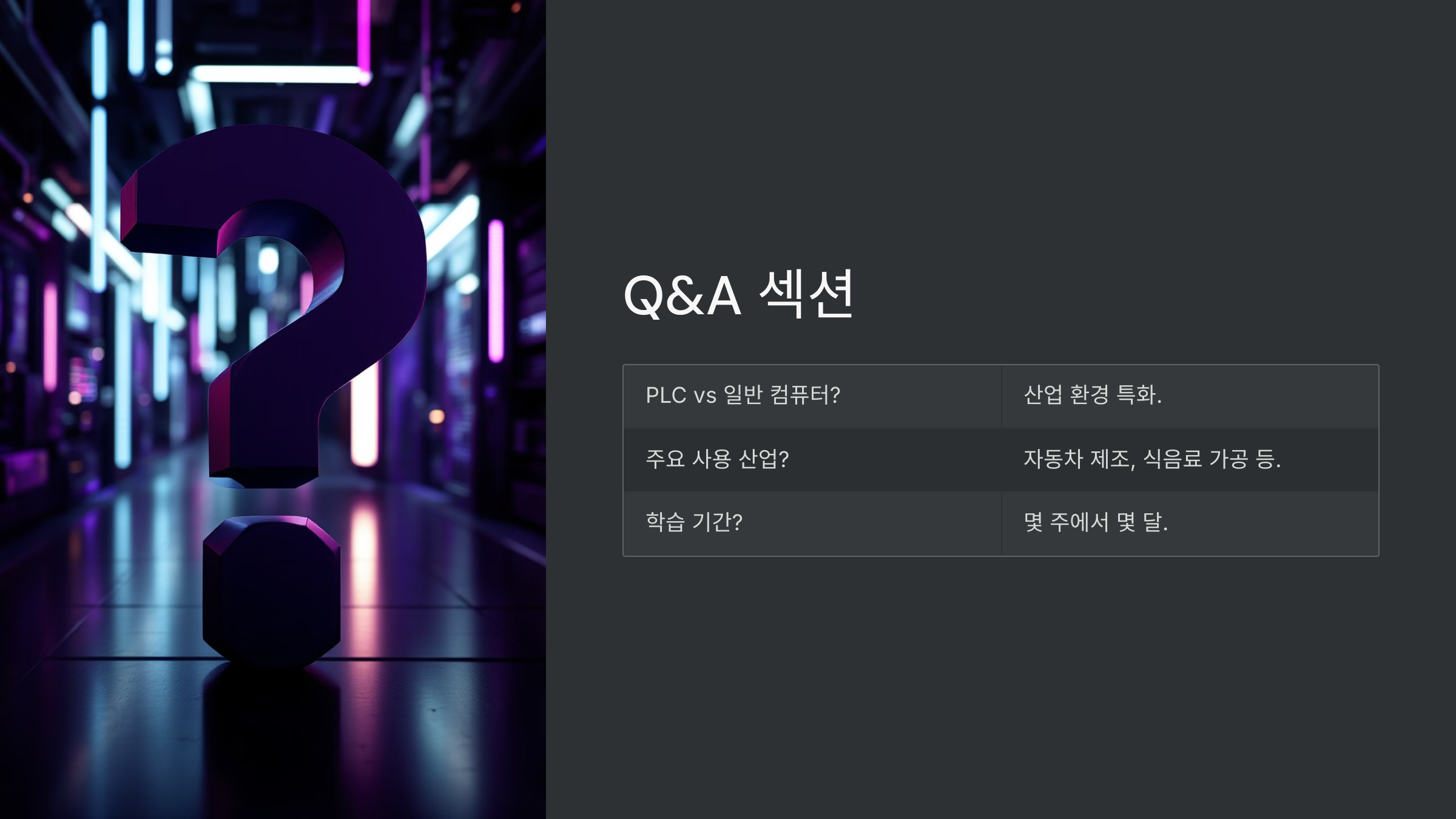 - A1: PLC는 일반 컴퓨터와 달리 산업 환경에 특화되어 있으며, 고온, 진동, 먼지 등의 조건에서도 견딜 수 있도록 설계되었습니다. 또한, 실시간 제어에 특화된 기능을 갖추고 있습니다.