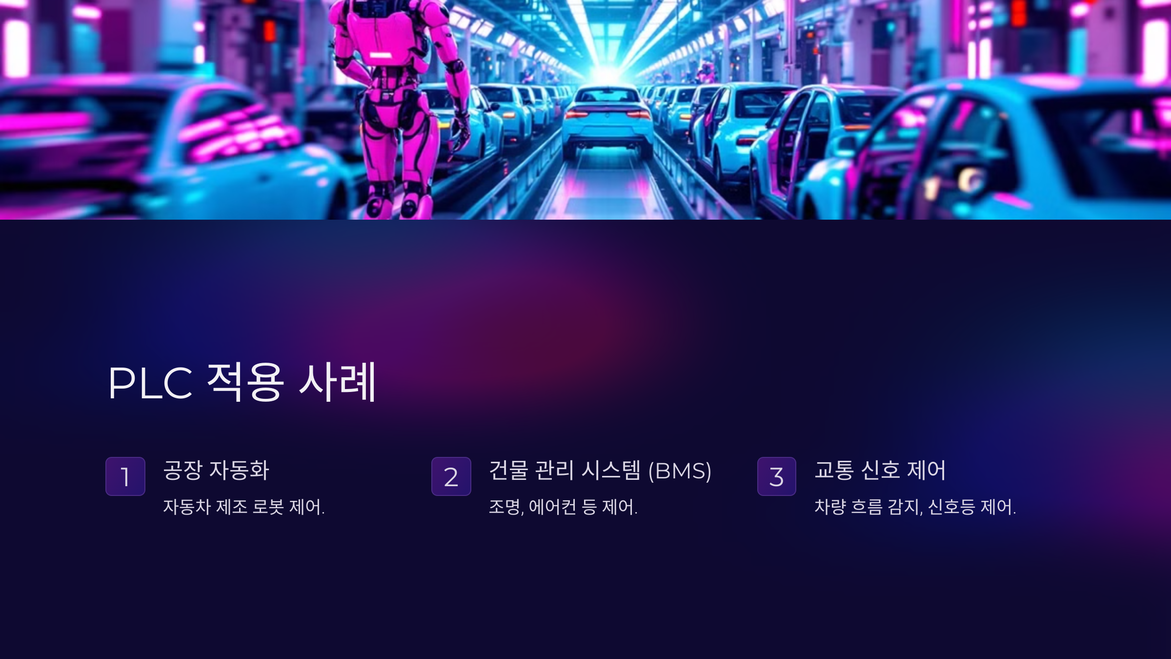 PLC는 주로 자동차 제조와 같은 공장 자동화 시스템에서 널리 사용됩니다. 예를 들어, 조립 라인에서 각 작업 단계를 제어하는 데 PLC가 사용됩니다. 자동차의 차체가 로봇 팔에 의해 용접되는 과정에서 각 로봇 팔이 정확한 타이밍에 작동할 수 있도록 PLC가 센서 신호를 처리하고 제어 명령을 보냅니다.
