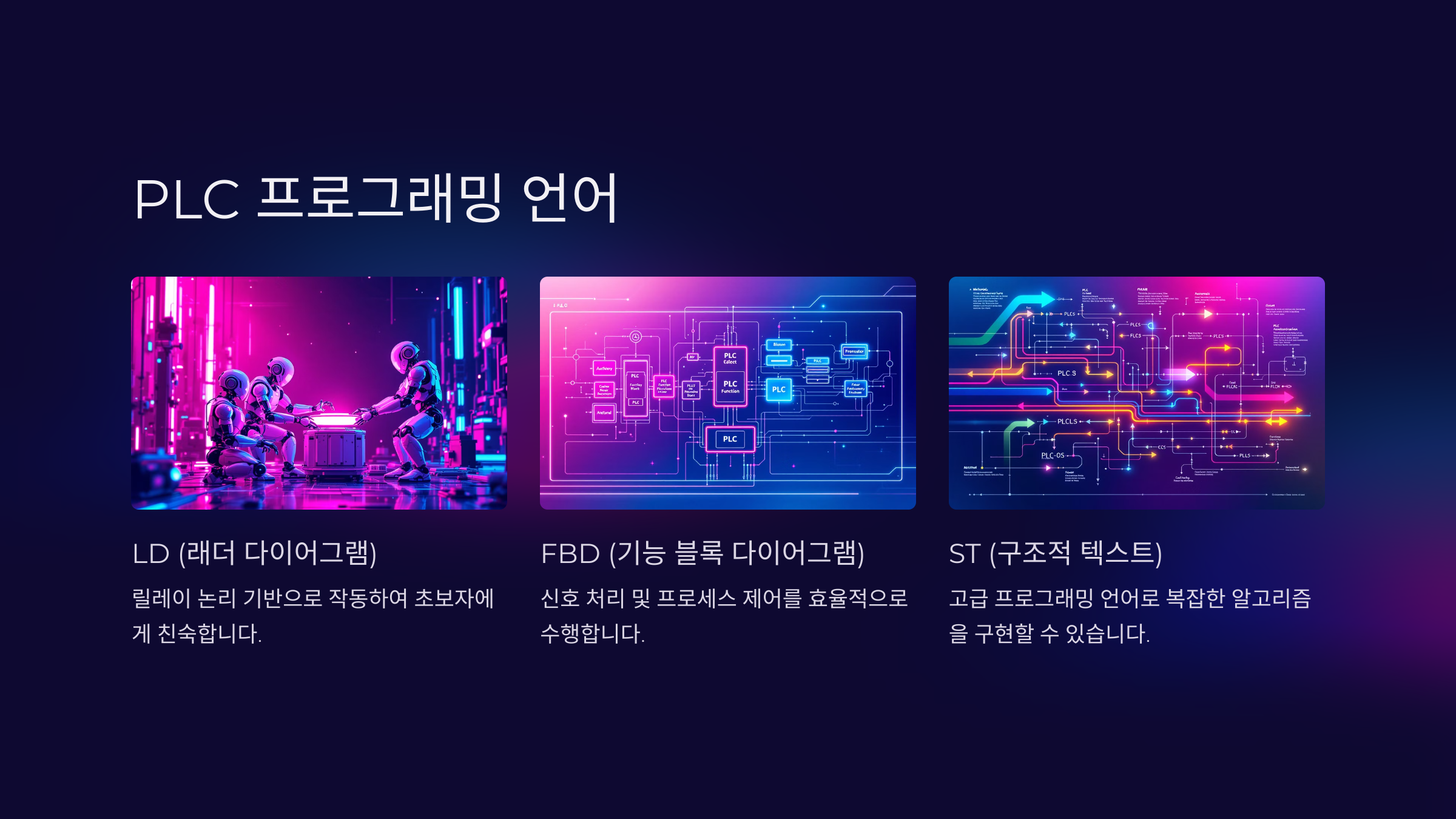 PLC는 다양한 프로그래밍 언어를 지원하며, 가장 널리 사용되는 몇 가지 언어는 다음과 같습니다.