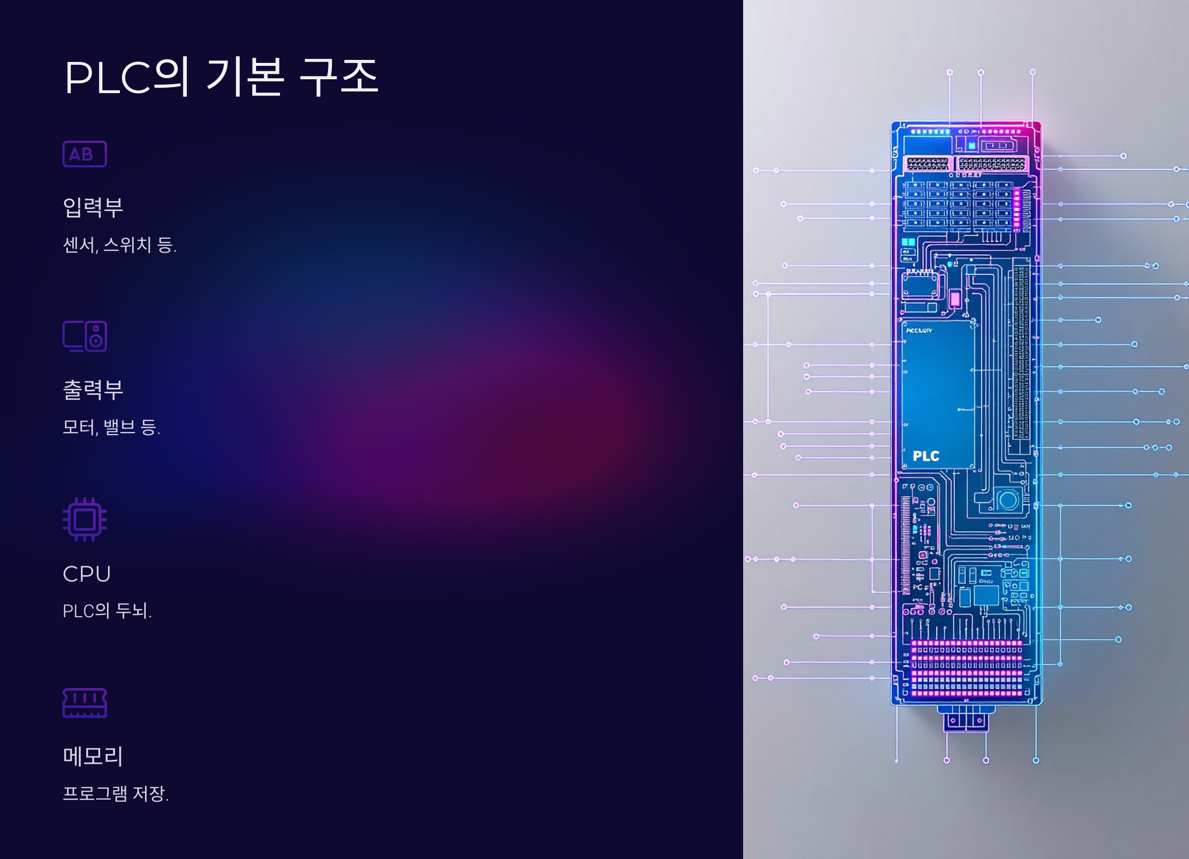 - CPU: PLC의 두뇌로서, 입력 신호를 처리하고 프로그램에 따라 제어 명령을 생성합니다.
