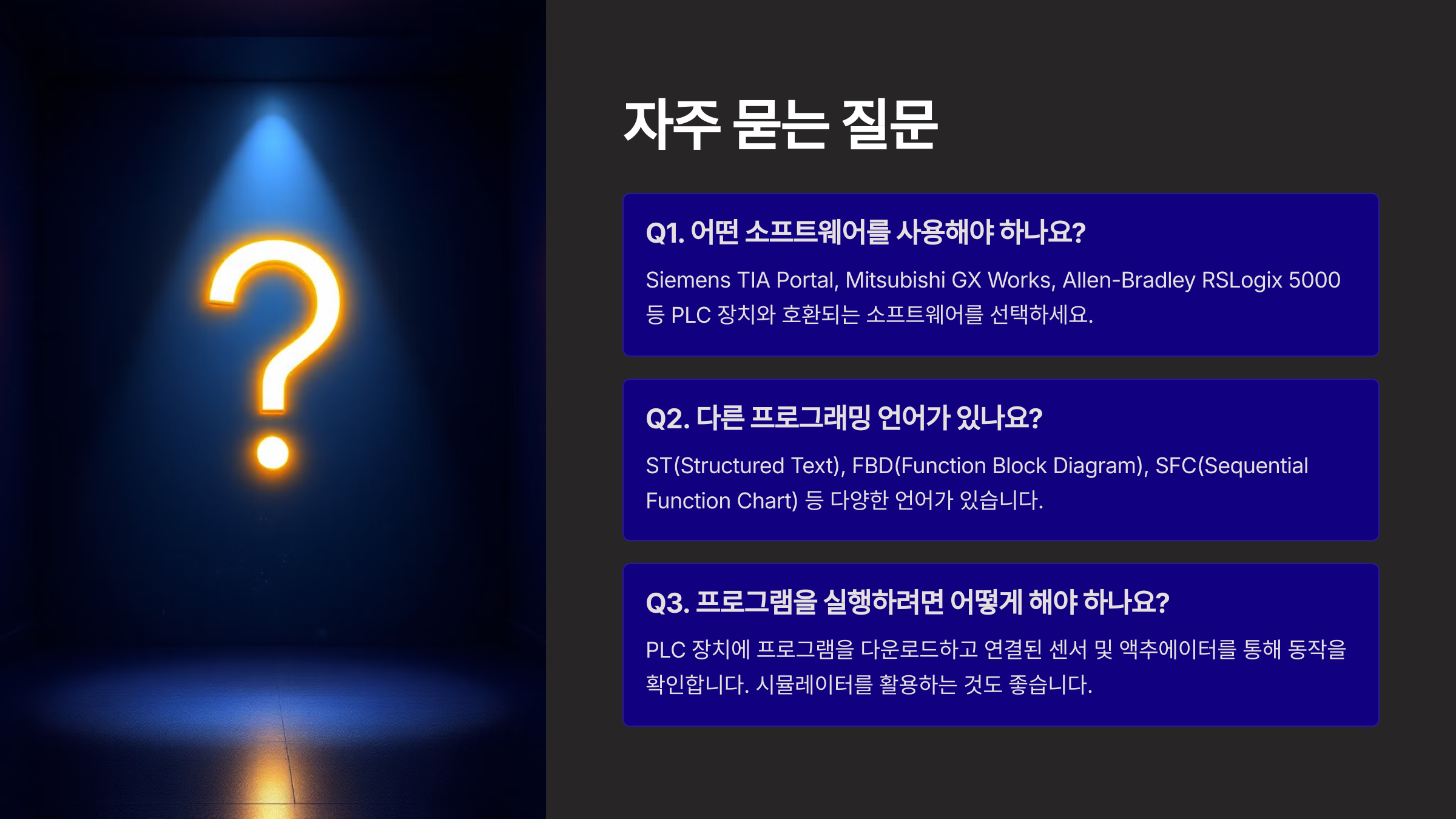 A3. PLC 장치에 프로그램을 다운로드하고, 장치에 연결된 실제 센서 및 액추에이터를 통해 동작을 확인할 수 있습니다. 소프트웨어 시뮬레이터를 먼저 사용해보는 것도 좋은 방법입니다.