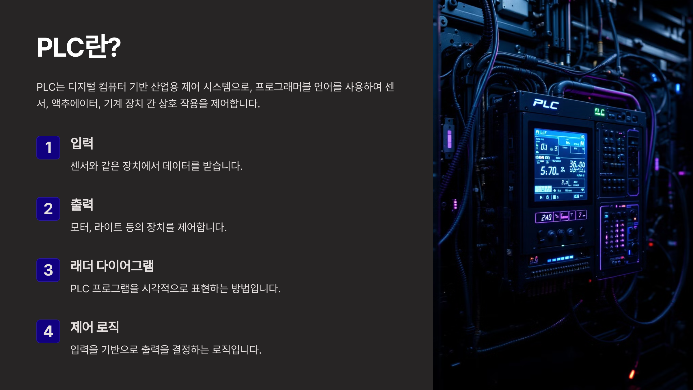 PLC는 디지털 컴퓨터를 기반으로 한 산업용 제어 시스템입니다. PLC는 프로그래머블 언어를 사용하여 다양한 센서, 액추에이터 및 기계 장치 간의 상호작용을 제어합니다. 주요 키워드는 입력, 출력, 래더 다이어그램, 제어 로직입니다.