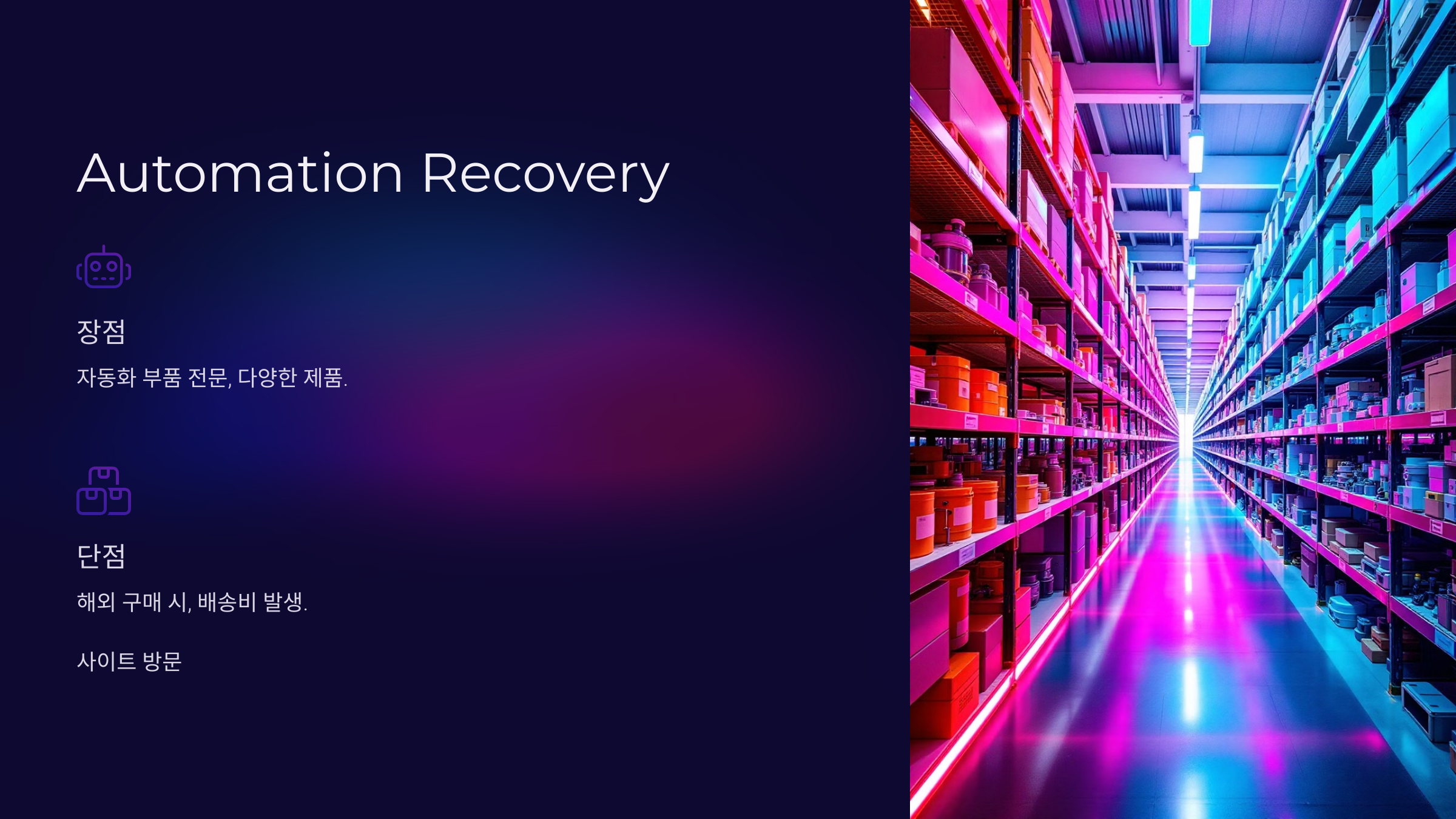 Automation Recovery는 중고 산업 자동화 부품에 특화된 온라인 판매 사이트로, 서보 모터, PLC, 감속기, LM가이드 등 다양한 중고 부품을 판매하고 있습니다. 리퍼비시 제품도 판매하여 일정 품질 보증을 받을 수 있습니다.