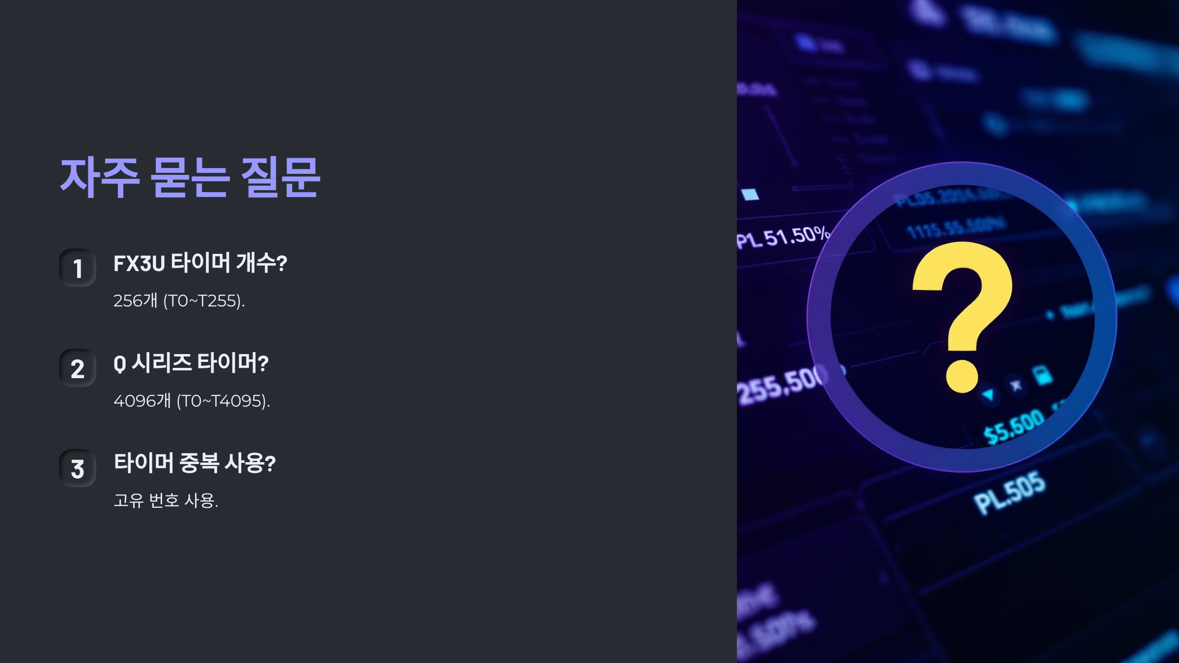 Mitsubishi Q 시리즈는 대형 시스템에서 주로 사용되며, 더 많은 타이머를 제공합니다. Q 시리즈에서는 T0부터 T4095까지 사용할 수 있으며, 총 4096개의 타이머가 지원됩니다. 이로 인해 대규모 공정 제어에 적합합니다.
