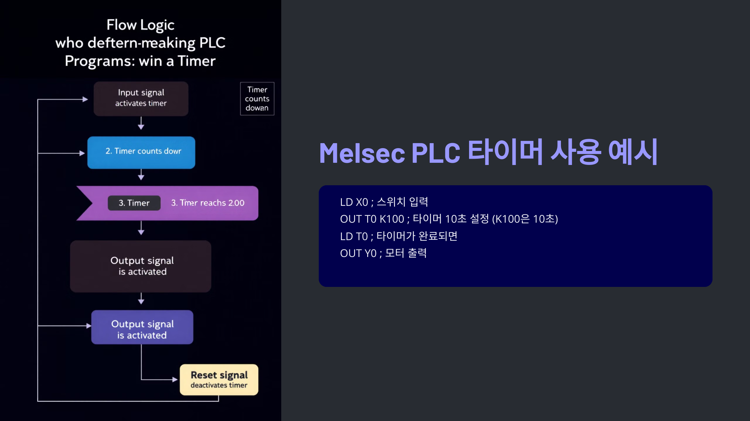 위 프로그램은 스위치 X0가 켜지면 타이머 T0가 10초 동안 동작한 후 모터 Y0를 켜는 간단한 제어 로직입니다. 이처럼 타이머는 매우 다양한 방식으로 사용될 수 있으며, 산업 환경에서 시간 기반 작업을 제어하는 데 매우 유용합니다.