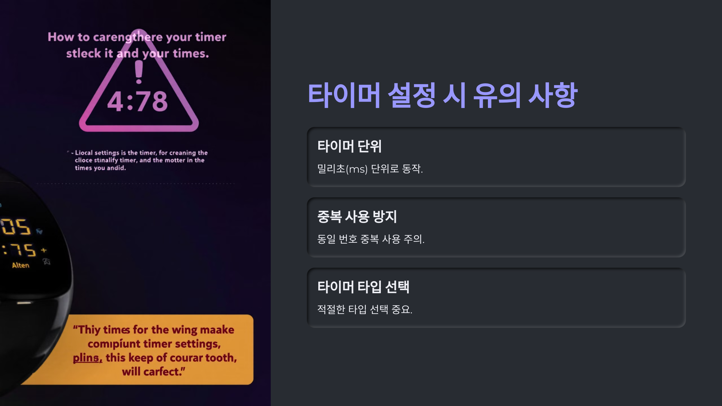 - 타이머의 단위: 타이머는 일반적으로 ms(밀리초) 단위로 동작합니다. 설정 시 사용하는 시간 단위를 정확히 이해하고 입력해야 합니다.