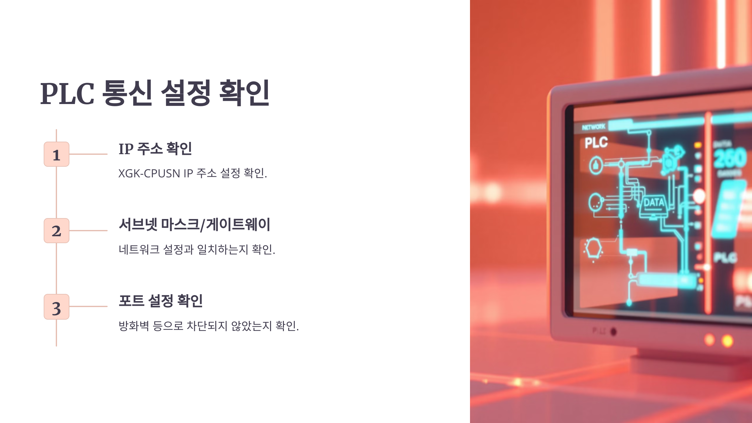 - PLC IP 주소 확인: XGK-CPUSN의 IP 주소가 올바르게 설정되어 있는지 확인합니다.
