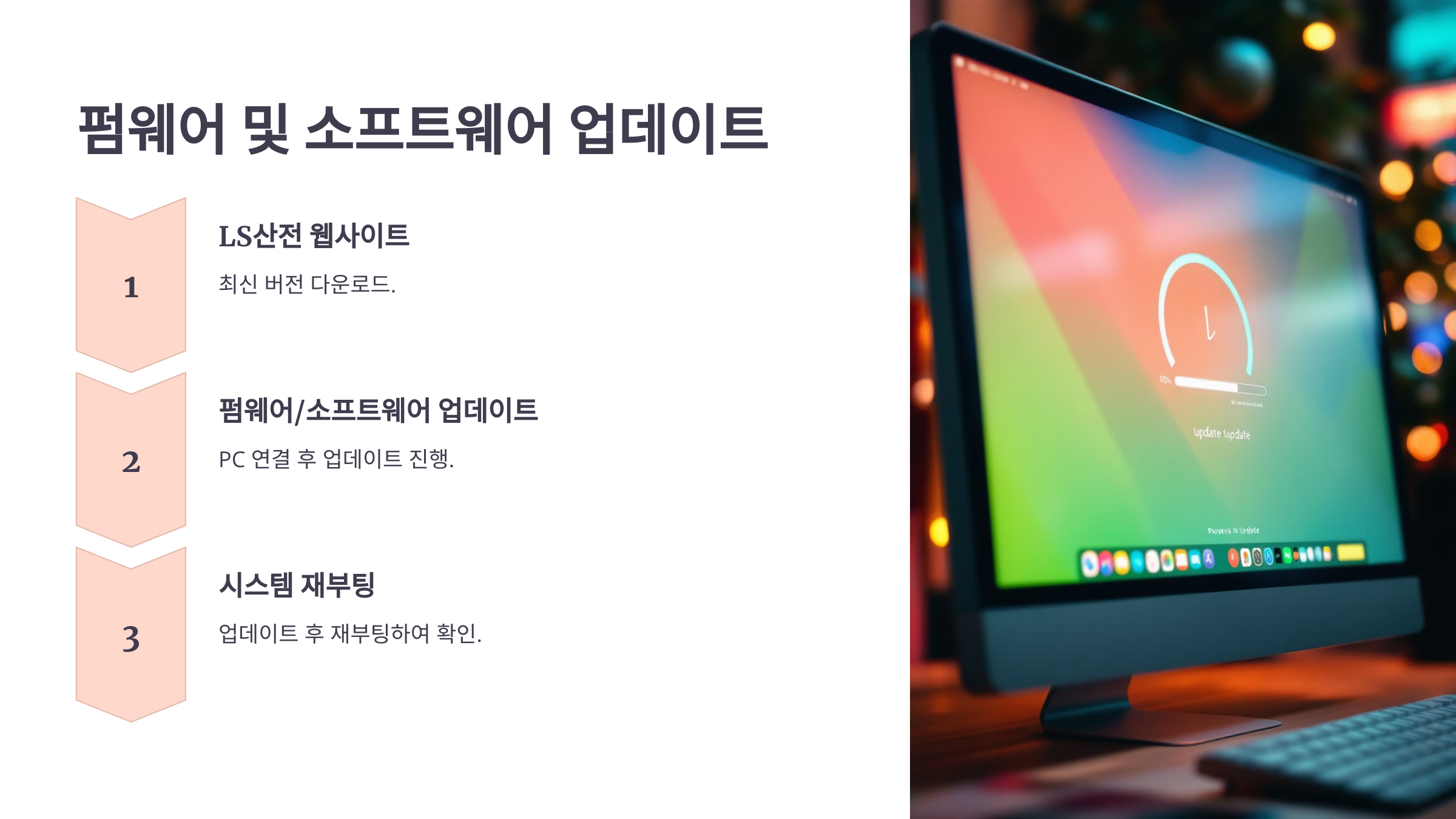 LS산전 공식 웹사이트에서 최신 펌웨어를 다운로드한 후, PLC에 연결된 PC에서 펌웨어 업데이트 소프트웨어를 사용해 업데이트를 진행할 수 있습니다. 업데이트 후 시스템을 재부팅하여 문제가 해결되었는지 확인합니다.