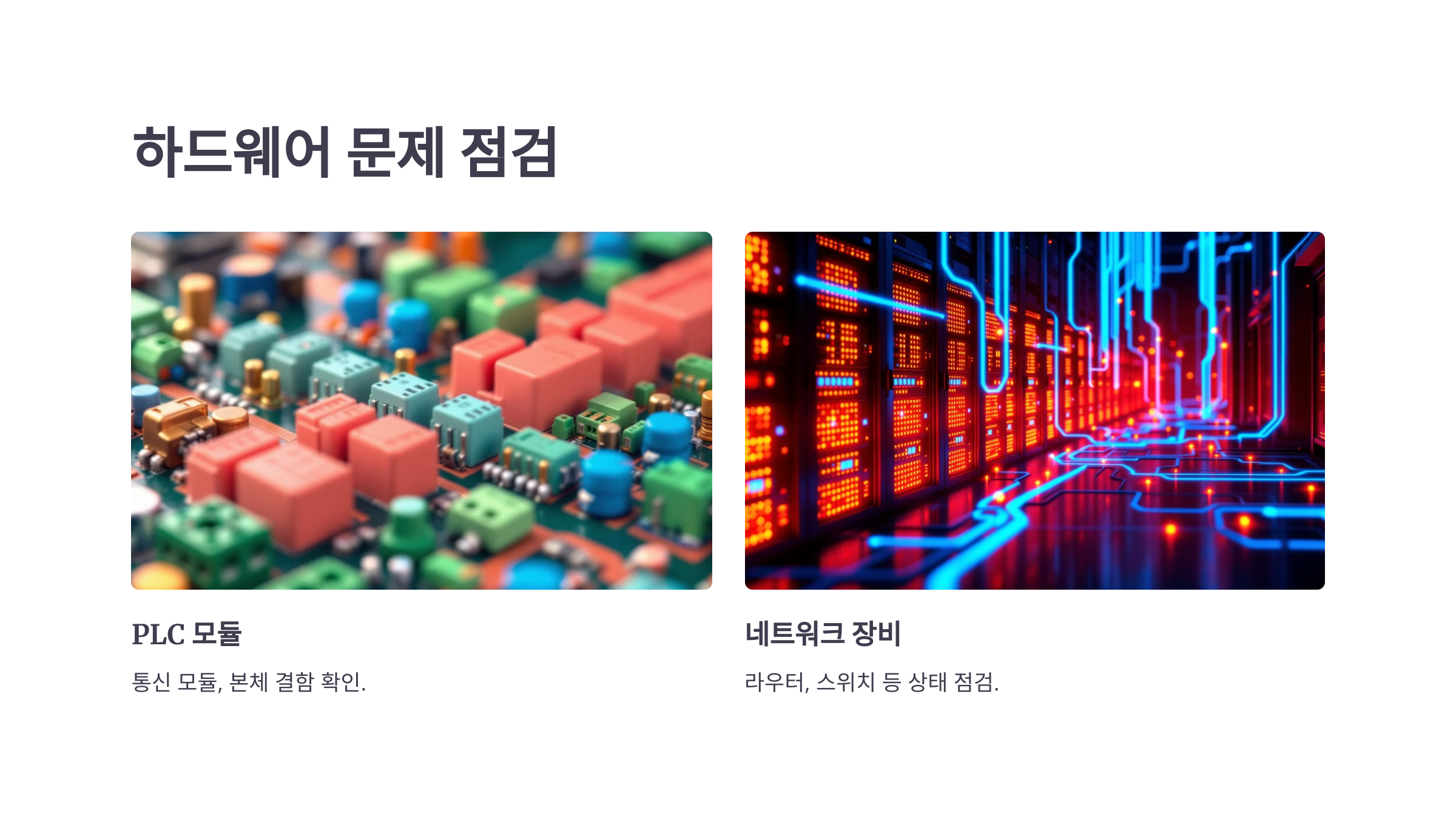 때때로 하드웨어적인 문제가 원격 모니터링의 끊김을 초래할 수 있습니다. PLC 자체나 네트워크 장비에 결함이 있으면 통신이 원활하지 않게 됩니다. PLC 모듈이나 통신 장비가 문제가 없는지 점검하고, 필요한 경우 하드웨어를 교체해야 합니다.