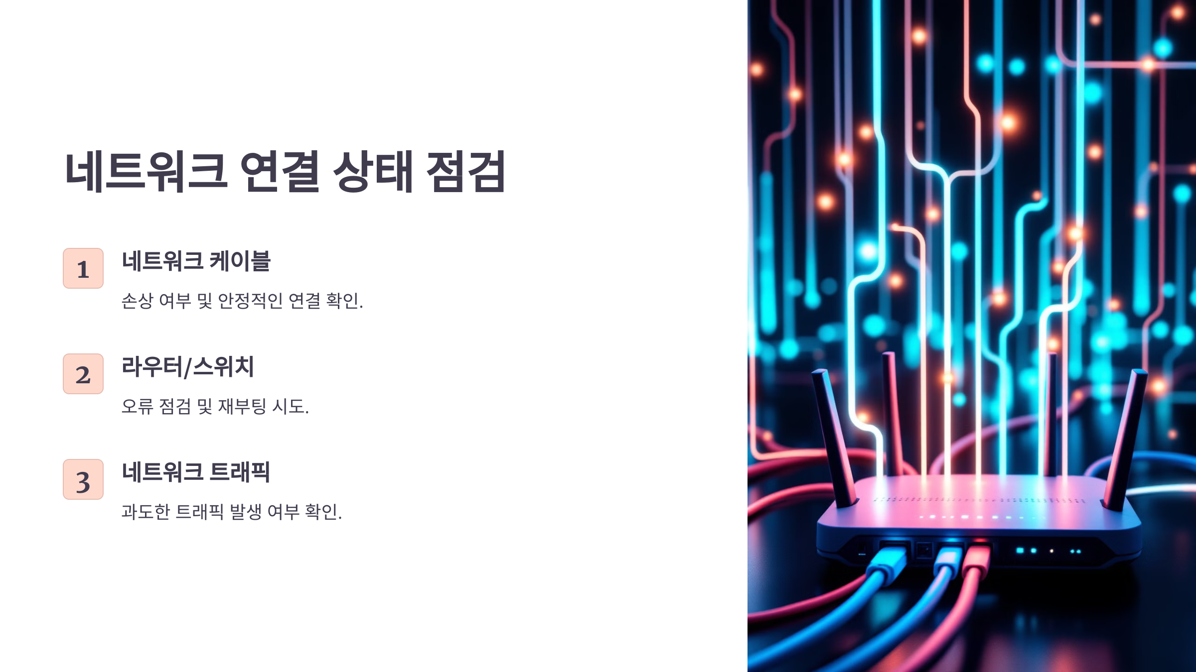 - 네트워크 케이블 상태 확인: 케이블이 손상되었거나 불안정하게 연결되어 있는지 확인하세요.