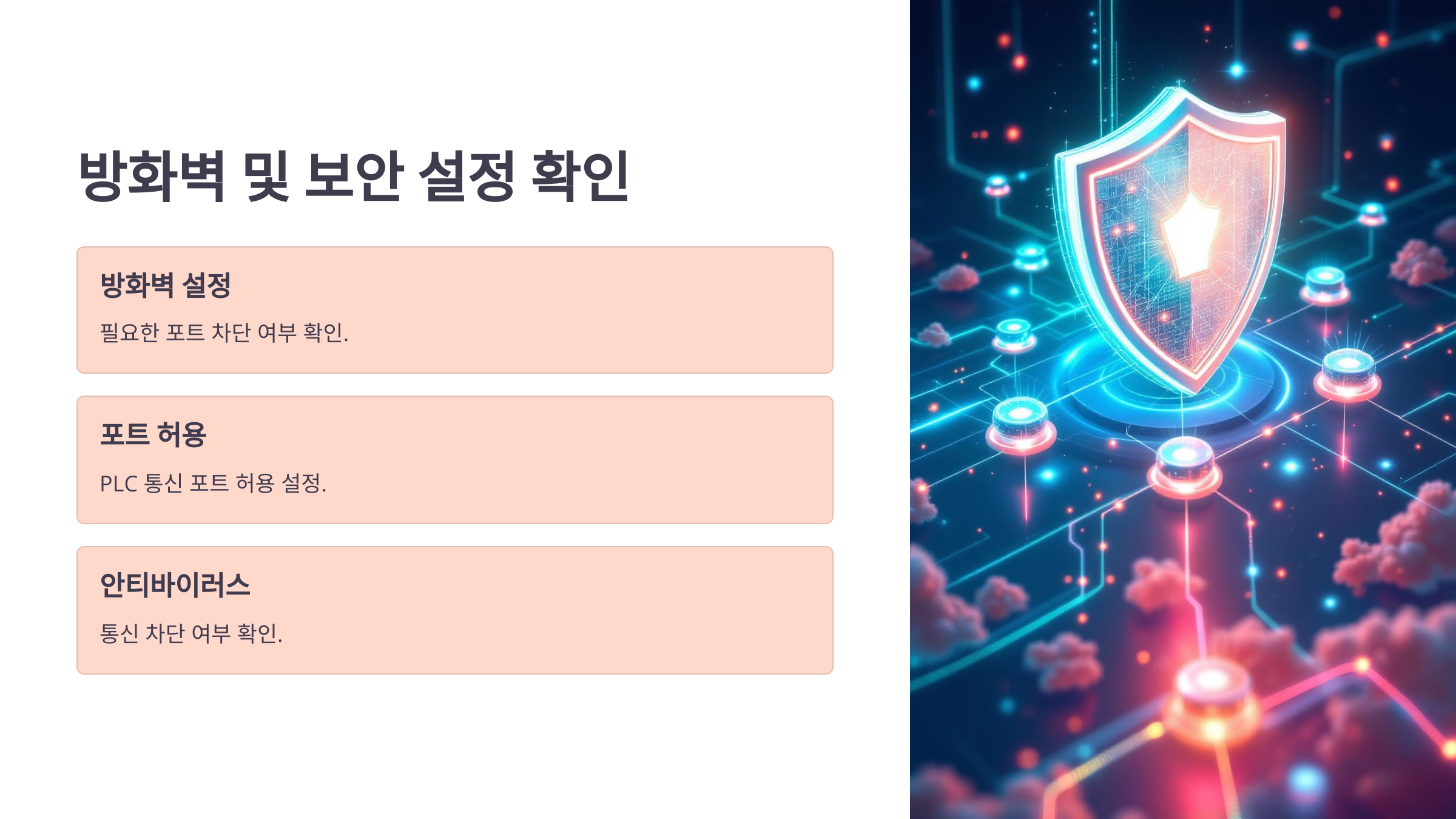 - 허용된 포트 추가: 모니터링 소프트웨어나 PLC에서 사용하는 포트를 방화벽에서 허용합니다.