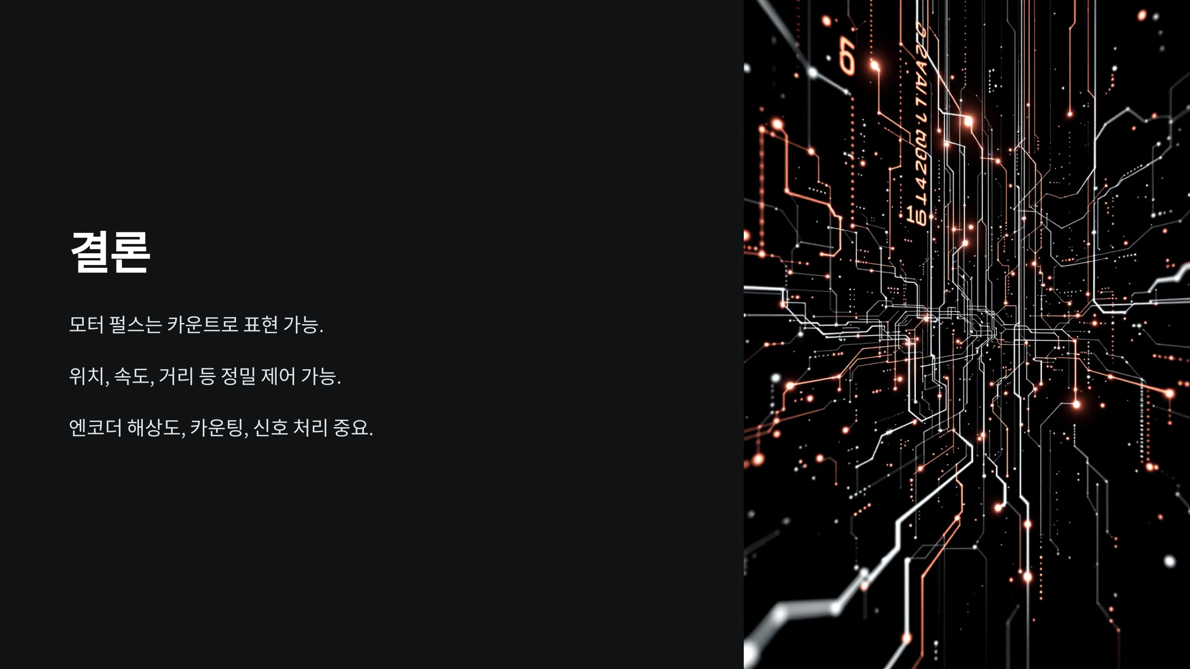 엔코더의 해상도가 높을수록 더 정밀하게 펄스를 카운트할 수 있으며, 모터의 위치를 보다 정확하게 추적할 수 있습니다. 하지만 해상도가 높으면 처리해야 할 데이터가 많아지기 때문에 컨트롤러의 성능도 고려해야 합니다.